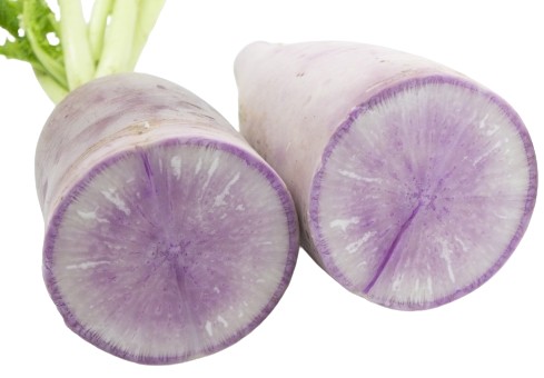 外皮は首辺りが濃い紫色で胴から先までは少し薄い紫色で、輪切りにすると果肉の中心部にもうっすらと紫色が入っています。この紫色の色素はアントシアニンで、レモンやお酢などの酸性のものに触れると、紫色から赤色に変化します。甘酢漬けやなますにすると鮮やかに仕上がります。辛味が少ないので生のままサラダやバーニャカウダでも良いですし、おろしにすると薄紫色の大根おろしになります。付け合わせや彩りに幅広くお使いいただけます。