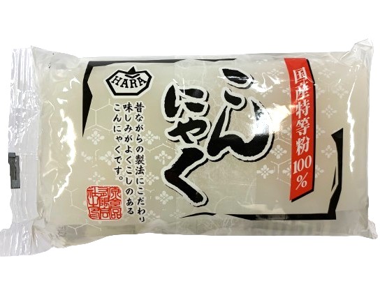 こんにゃく芋の精粉(せいこ)を使うと白いこんにゃくになり、生芋を使った場合は芋の皮が入ってしまうため、黒っぽくなります。最近の黒こんにゃくは、精粉を使ったものが多いのですが、昔からの作り方を見慣れている地方では白いこんにゃくがあまり好まれなかったため、生芋から作るこんにゃくに似せるように、アラメやヒジキなどの海藻の粉末で色をつける場合が多いようです。なお、白いこんにゃくの中にみられる黒い斑点は、原料のこんにゃく芋由来の天然物ですので、品質には問題ありません。