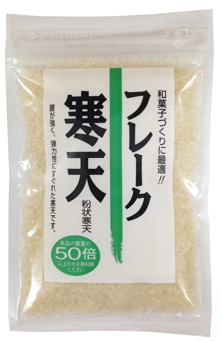 ☆糸寒天の良さをそのままに、ゴミなどの不純物や空気汚染などを避け、衛生的に作られた寒天です。☆調理時にゴミ等の不純物を取り除く必要はありません。(水洗い、裏ごし不要)☆品質が一定で、天然寒天よりも仕上がりにムラがありません。食べ方・使用方法☆5gに対して出来上がりが550〜600gになるようにお使いください。 1.本品5gに対し、水またはお湯350〜400cc(最低でも50倍以上)を目安に加えてもどします。 2.火にかけ沸騰後4〜5分炊いて充分煮溶かします。 3.寒天がとけたら、砂糖などで味を付けて型に流し込み固めます。 ★酸味を加える場合、あら熱がとれてから加えてください。☆みつ豆、杏仁豆腐、水ようかん、寒天寄せなどに。☆お米に混ぜて炊くと、ご飯がおいしくなります。保存方法・その他*直射日光・湿気を避けてください。栄養成分100g当たりエネルギー 158kcalたんぱく質 1.7g脂質 0.2g炭水化物 76.6gナトリウム 88mg水分 18.3g灰分 3.2g原材料紅藻海藻類(天草等)