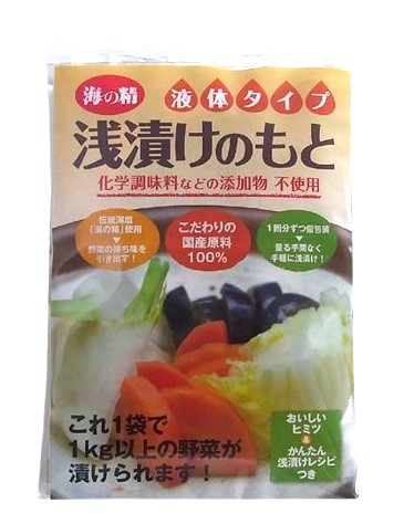 切った野菜100g〜200gに本品1袋(10g)をまぜ、1時間ほどで食べられます。1日置くと乳酸醗酵が進み、食べごろは3日ぐらいまでです。一般的には甘みには砂糖や甘味料、旨味には化学調味料や酵母エキスなどが使用されていますが、「海の精 浅漬けのもと」は砂糖や食品添加物を使用せず、食材そのものが甘みと旨味を醸し出します。