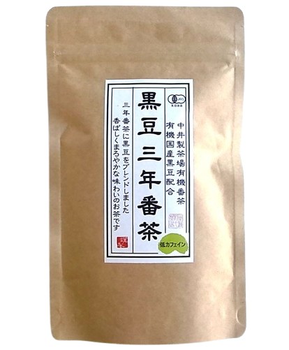 有機三年熟番茶に、有機国内産黒豆をブレンドした、香ばしくまろやかな味わいの体に優しいお茶です。有機三年番茶は、熟成した茶葉と茎を赤くなるまで蒸し、熱風で乾燥させてから貯蔵し程よく熟成させてから、昔ながらの製法でじっくり焙じています。有機国内産黒豆は、「大豆イソフラボン」「アントシアニン」などを多く含み、さまざまな効能が期待できると注目されています。この商品は、この二つをブレンドした日常的に飲んでいただける健康茶です。カフェインやタンニンなどの刺激物はほとんど含まないため、体にやさしいお茶になります。夏は冷やしてお召し上がりください。