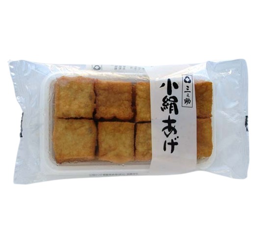 三之助らしいやわらかい絹あげとうふを作りたいと試行錯誤を繰り返して誕生しました。生の絹ごしとうふを揚げた瑞々しさととろりとした食感、外側の揚げ面の香ばしさが特長の絹あげです。原料の大豆は国産良質大豆、揚げ油は国産菜種の圧搾油を使用しています。やわらかい絹あげは、小絹あげ専用の豆腐を作り、丁寧な水さらしと水切り工程の後、専用のカッターで約3cmカクに切ります。このサイコロ状の生地を揚げ油の中でくっつかないよう揚げていきます。