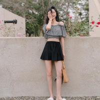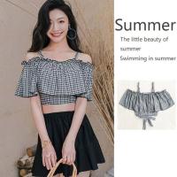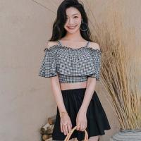 水着 レディース バンドゥ ビキニ キャミソール チェック柄スカート 体型カバー 中学生 高校生 女の子 オフショルダー ハイウエスト ママ水着