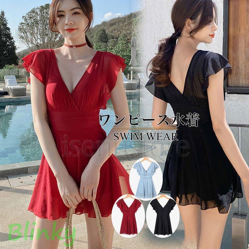 ワンピース水着 モノキニ ワイヤー Vネック オールインワン 水着 レディース ビキニ フレアバンドゥ 一体型 ショートパンツ 大人 ママ水着