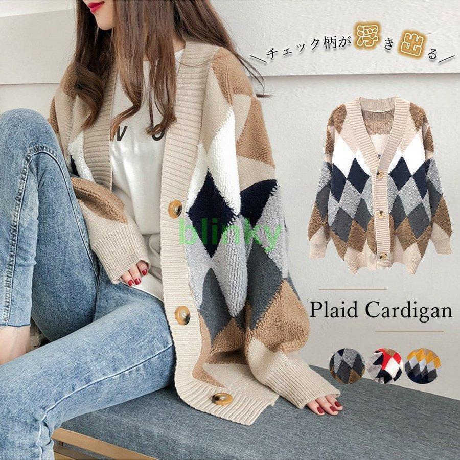 配色 ニットカーディガン レディース アーガイル柄 ニットアウター 長袖カーデ ゆったり ひし形 オーバーサイズ