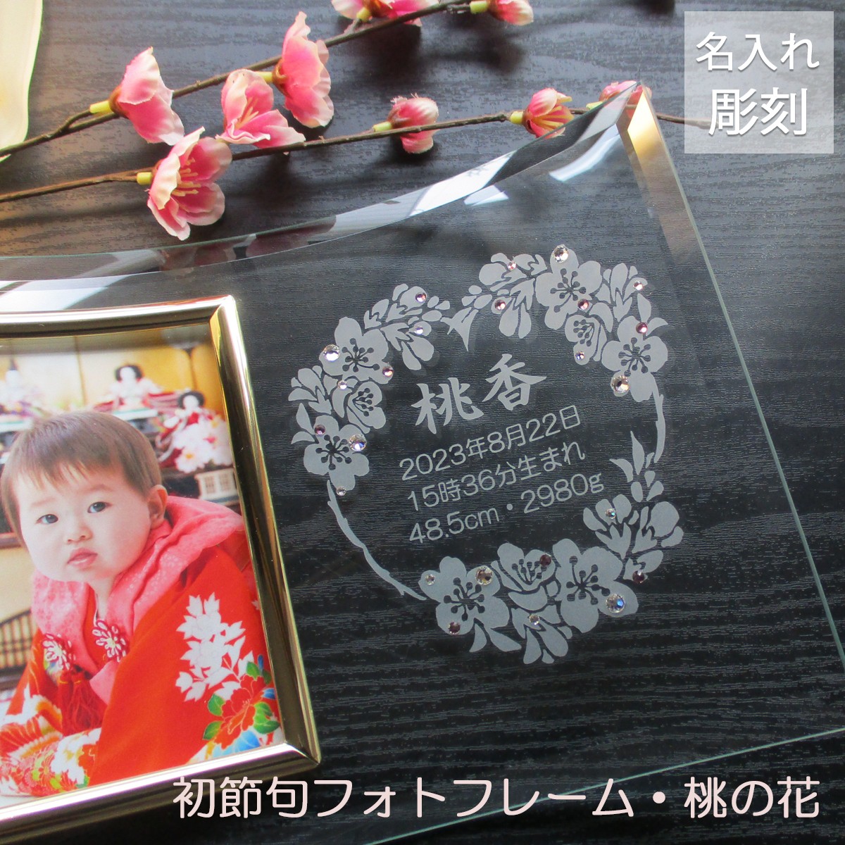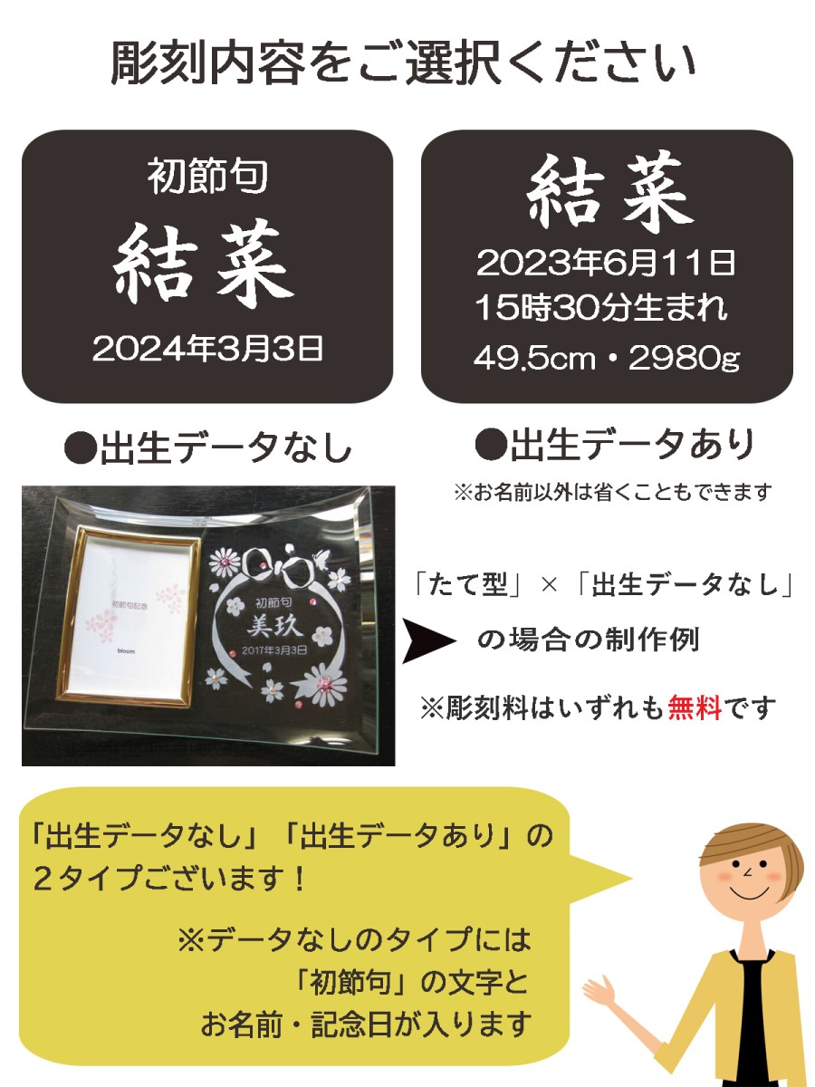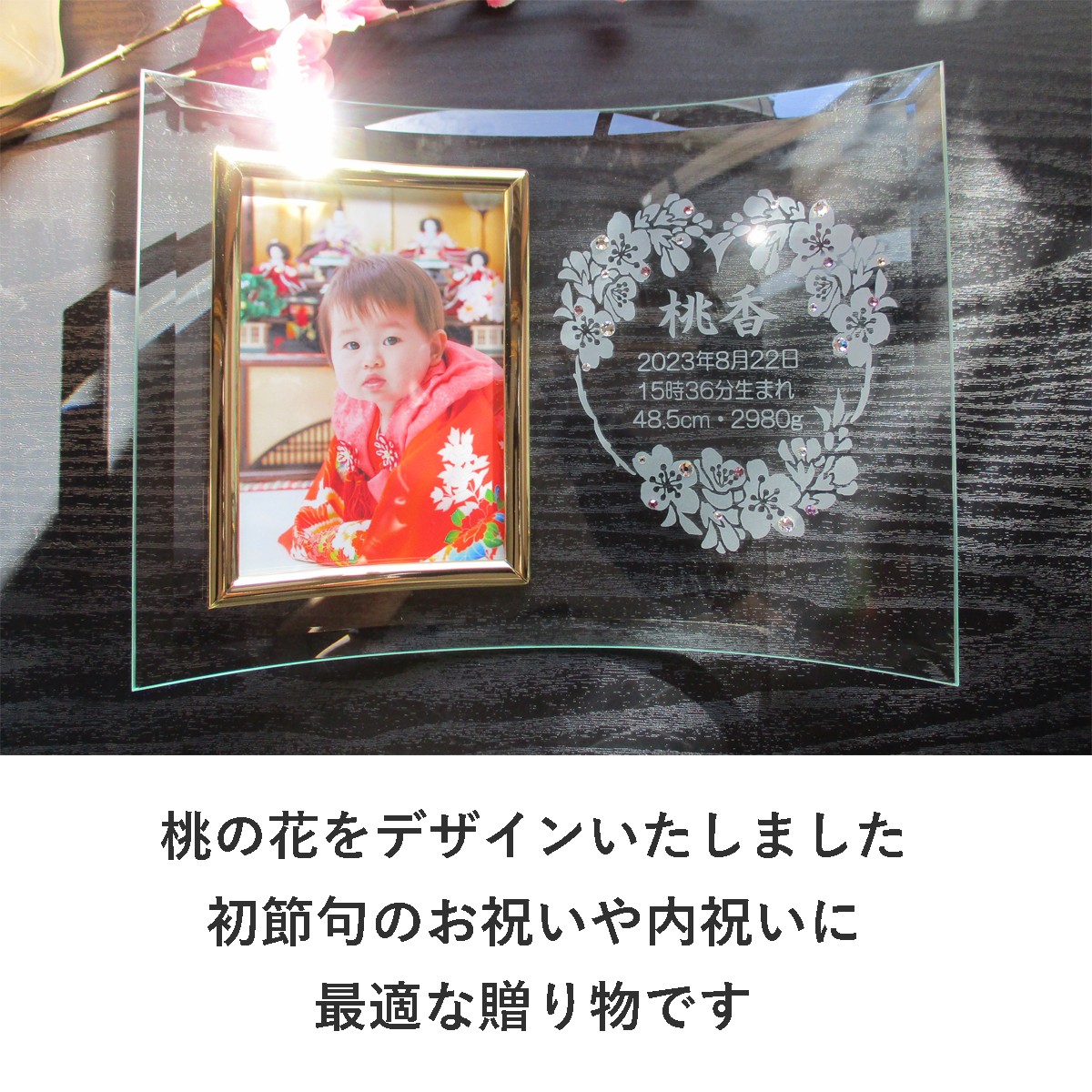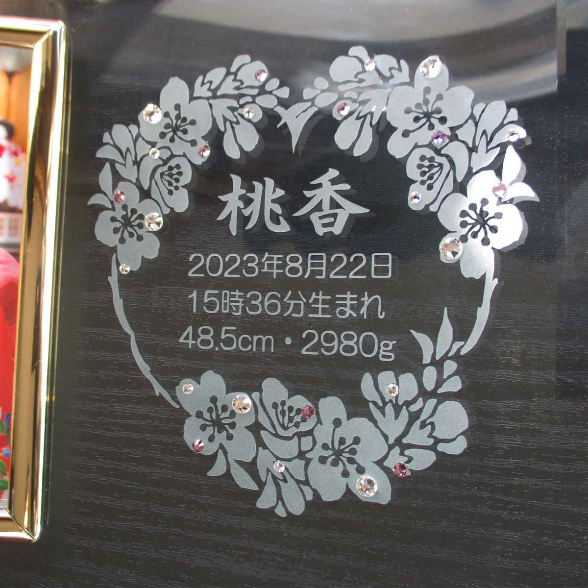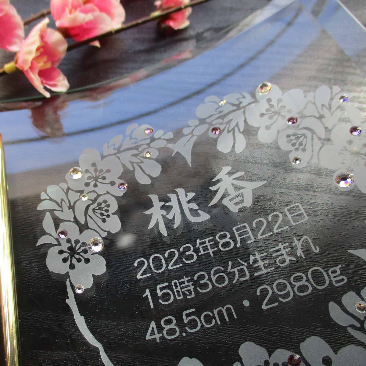 ガラス製のフォトフレームにお子様のお名前と出生データなどを彫刻したフォトフレームです。