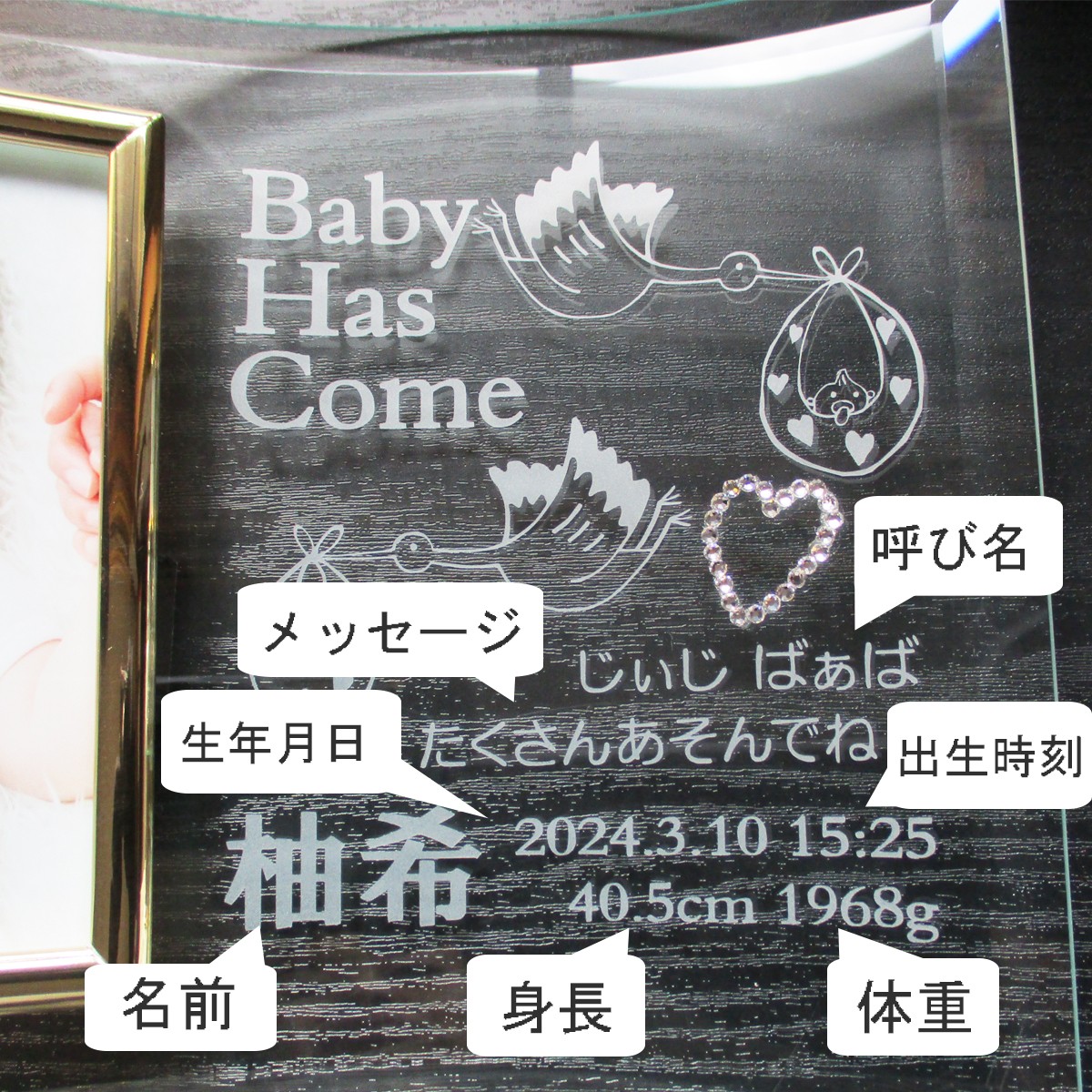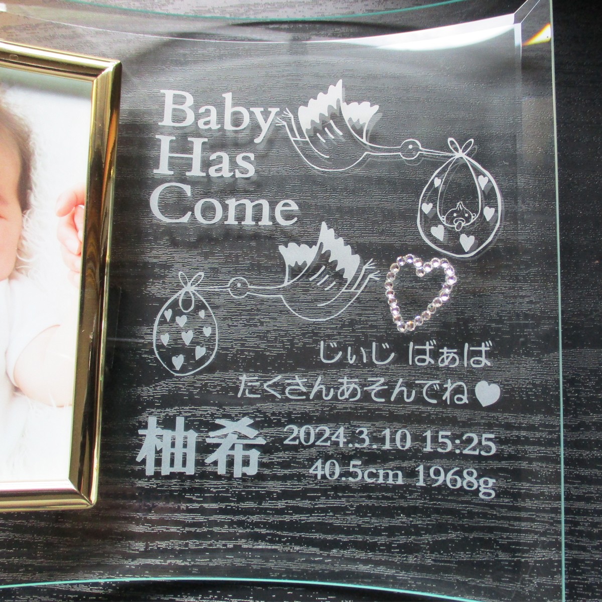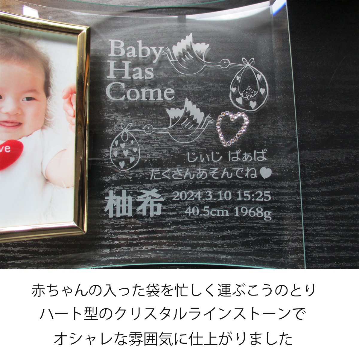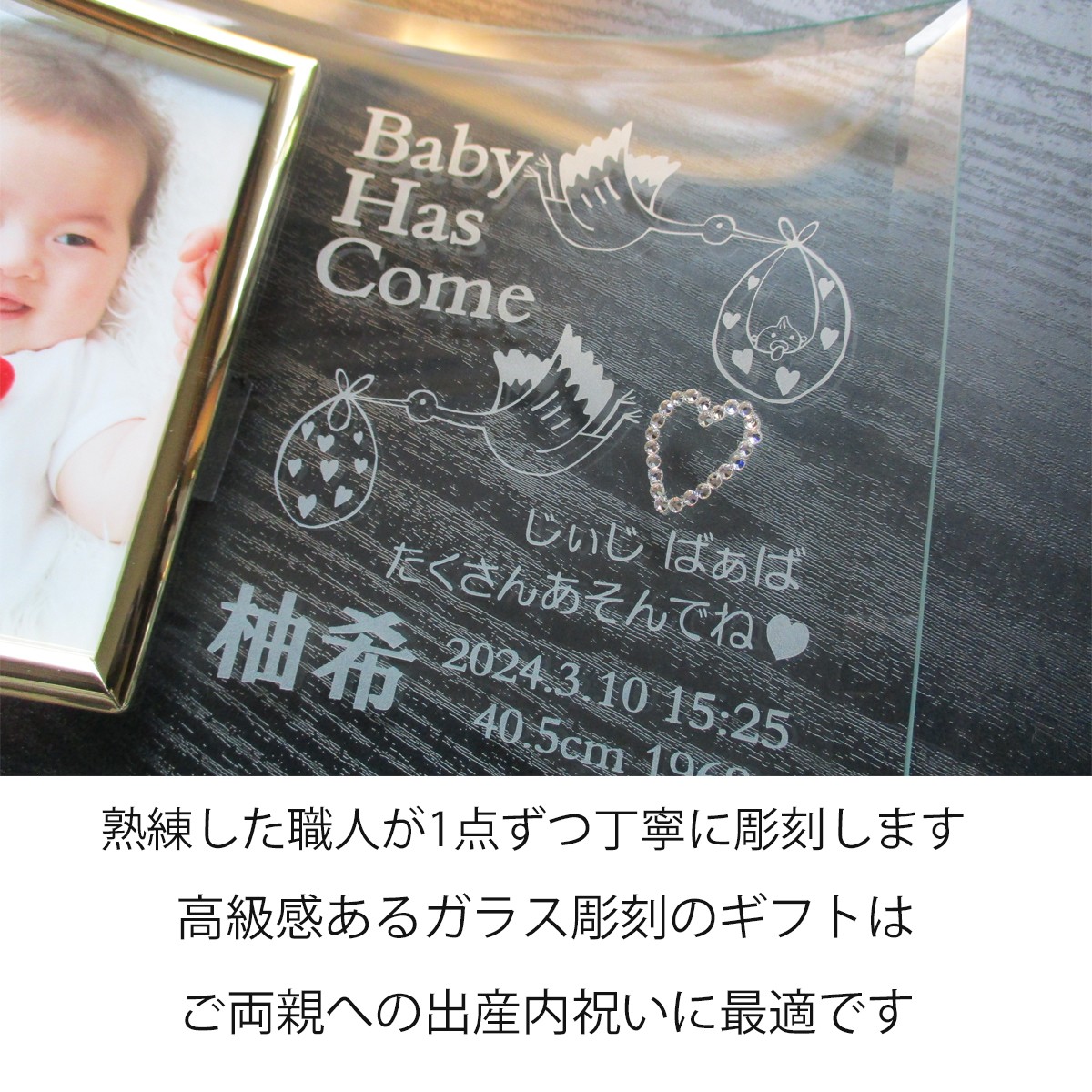 色褪せることのないガラス彫刻は赤ちゃん誕生のお祝いに最適です