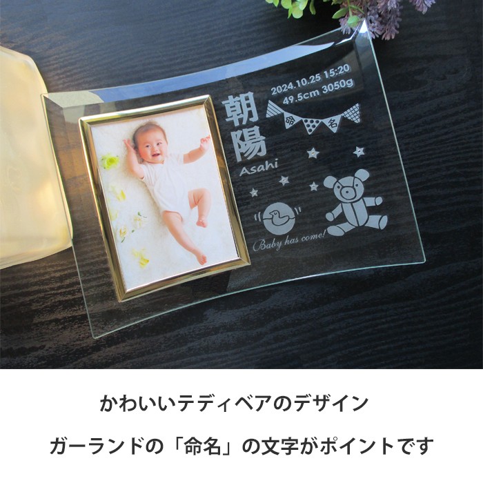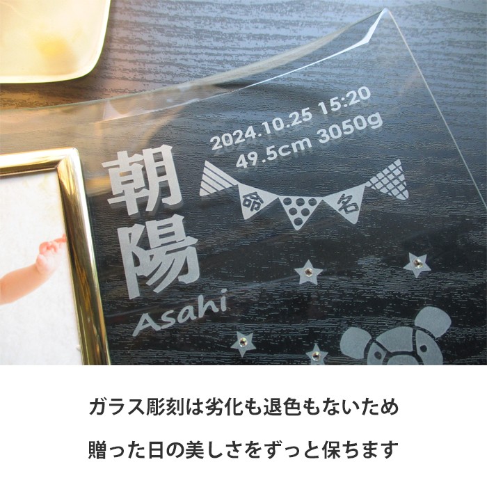 お子様の大切なお名前をガラスフォトフレームに彫刻いたします。