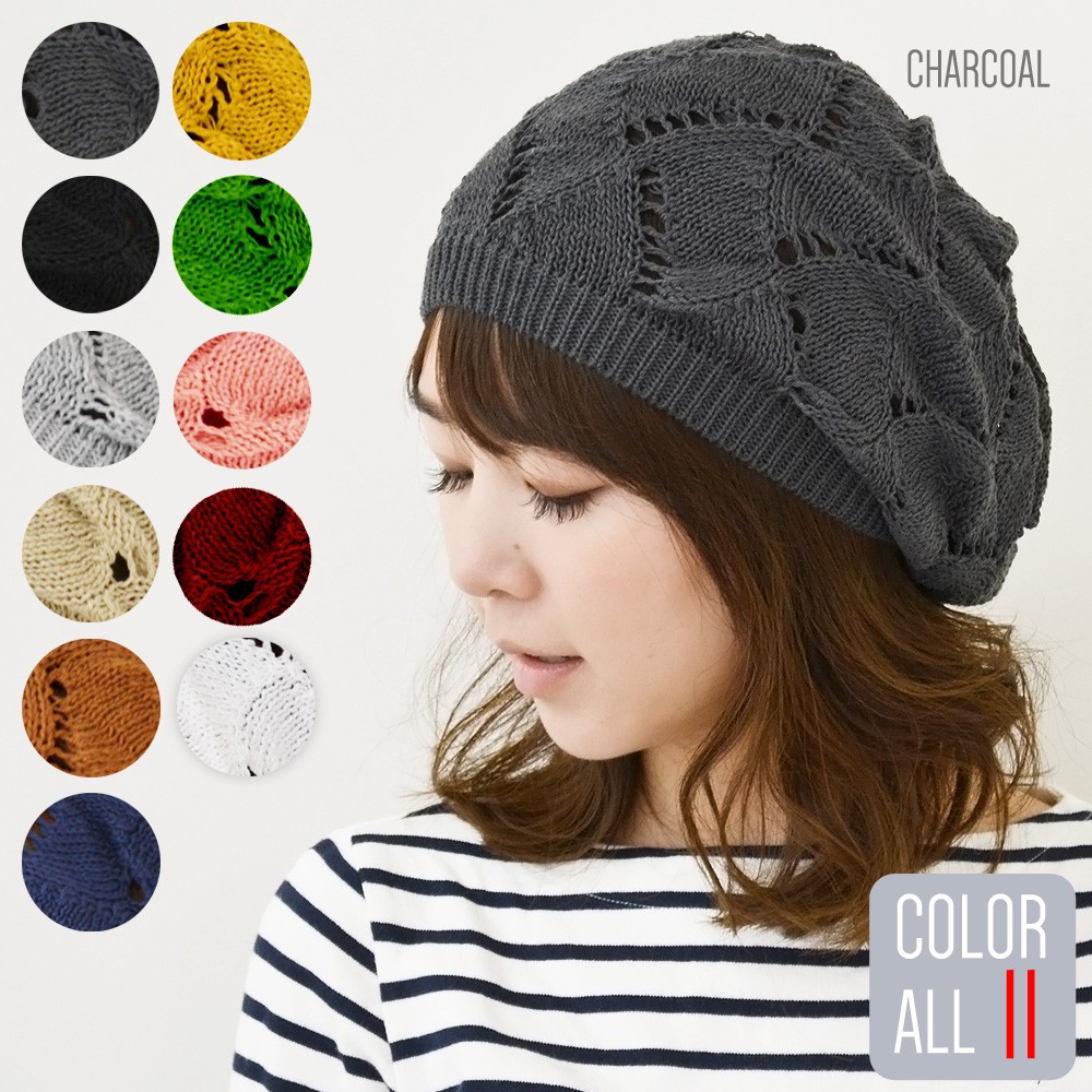 オシャレ度をアップさせてくれる模様編みのサマーニット透かしベレー帽です。