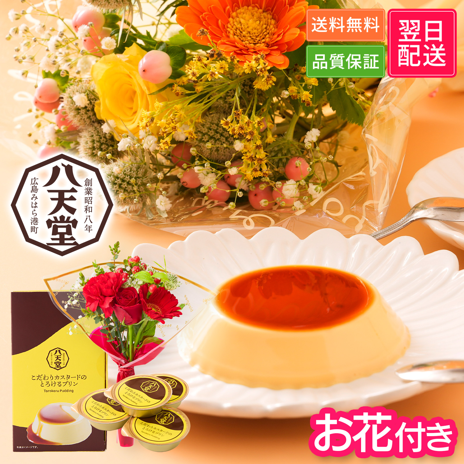 花 お菓子 お花 スイーツ ギフト 誕生日 八天堂 カスタードプリン お花8本ブーケ 高級 お花付き プレゼント 女性 洋菓子