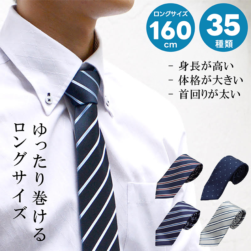 一般的なネクタイは約140〜145cmですが、ロングネクタイは +10〜25cm 長いのが最大の特徴です。