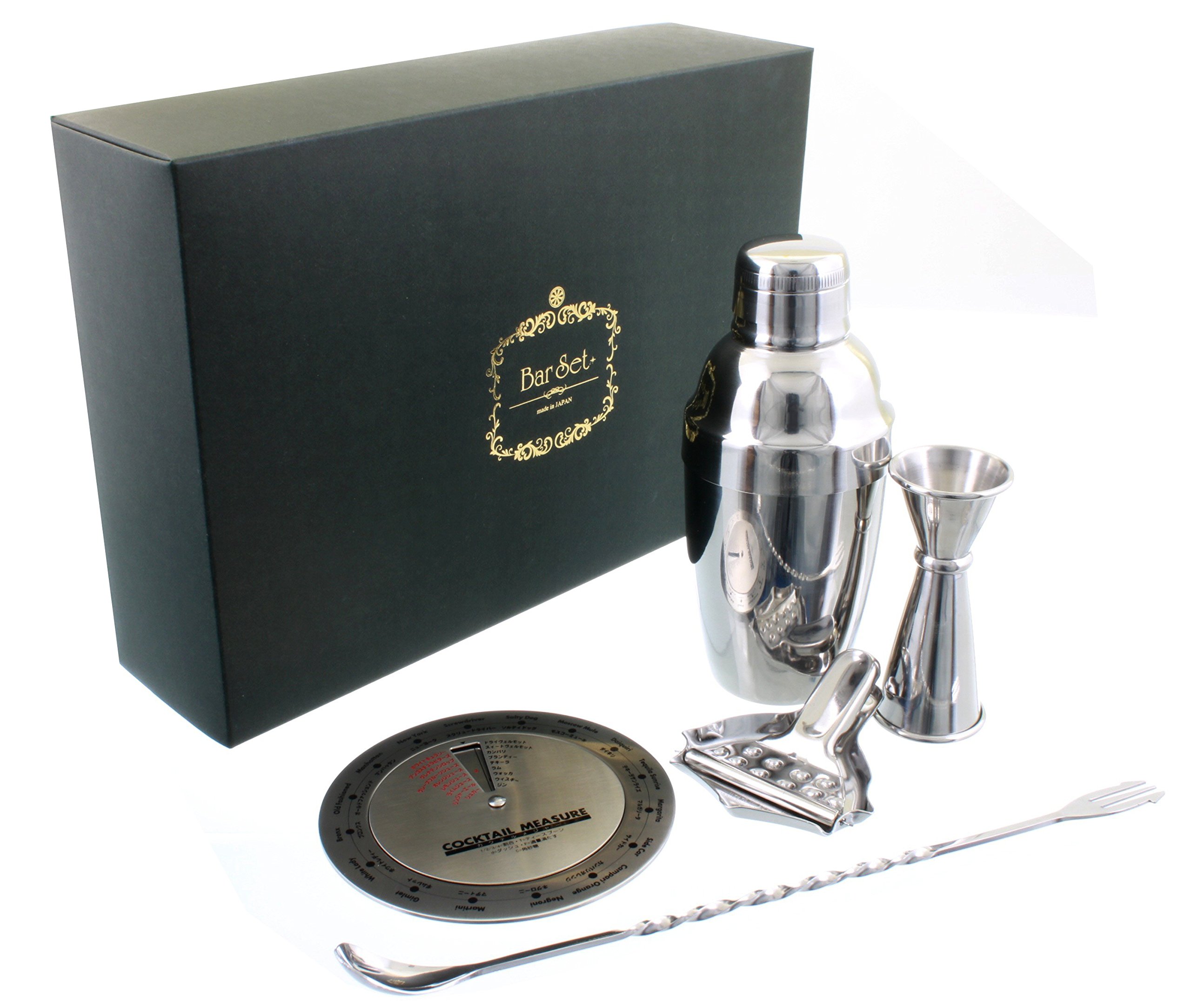 セット内容:カクテルシェイカー、メジャーカップ、バースプーン、末広型レモン絞り、カクテルメジャー、説明書、ギフトボックス