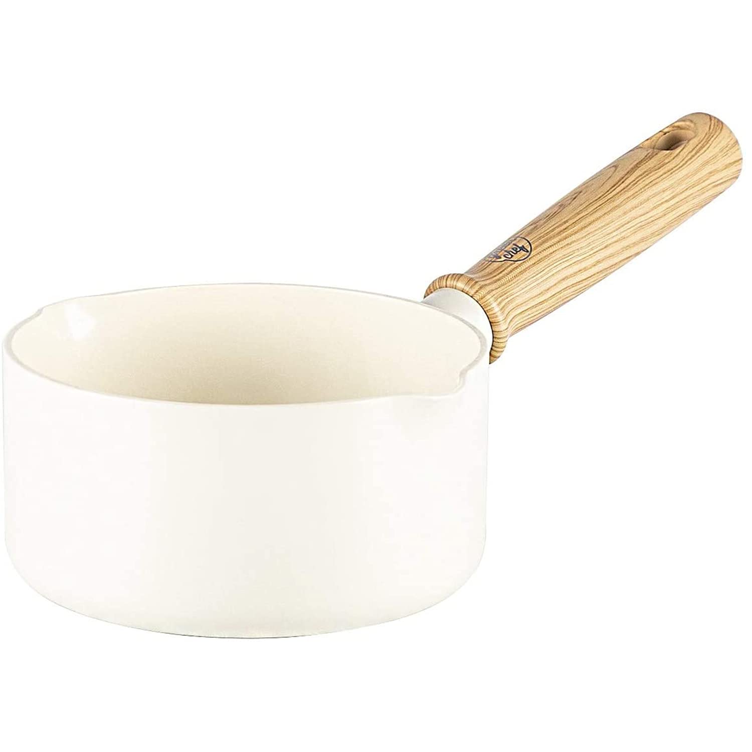 クリームホワイトの本体に木目調ハンドルが映える、 ビンテージホワイトシリーズのソースパン