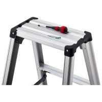 軽くて丈夫な脚立。丈夫さはそのままに最大30%の軽量化を実現。新開発「ワンタッチバー」で作業効率が向上。シリーズ全てJIS適合品に。品質・性能ともに安心。天板がフラットになり、袖や腰袋の引っかかりを防ぐ。移動の際は、バーを掴んだらそのまま開き止めを解除しながら持ち上げられる。踏ざん裏に張りを持たせ、肩当たりをやわらかく。幅広天板は工具などを置ける便利な天板トレー形状。