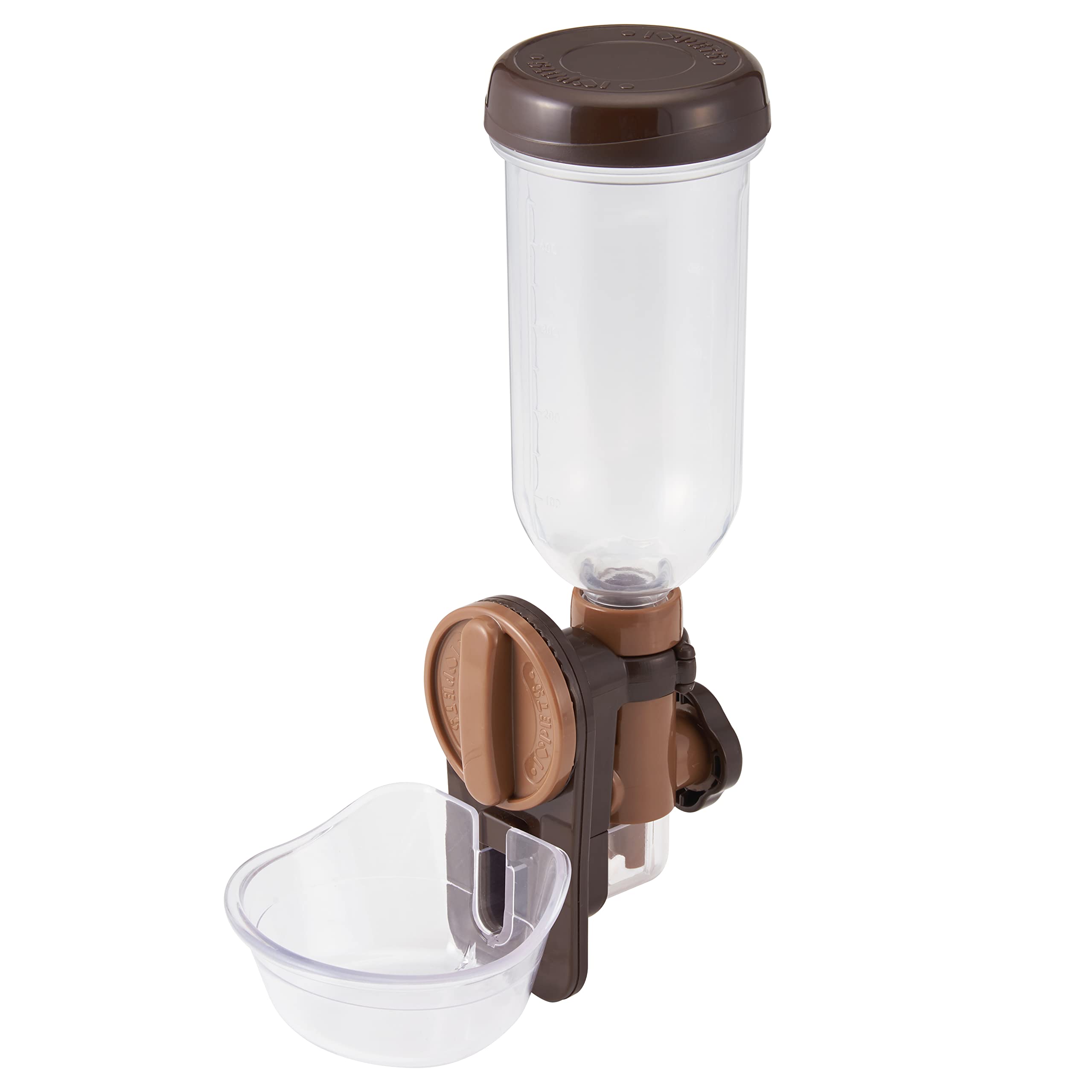 らくらく飲めて、らくらく洗えるボトル付きケージ取り付け式給水器です。ボトルは、上から継ぎ足しもできメモリがついているので健康管理にも便利です。たっぷり飲める幅広皿で、透明で中が見えやすく、お皿だけ外してサッと洗うことができます。市販の500mlペットボトルが使用できます。漏れにくい止水コック付きで安心です。