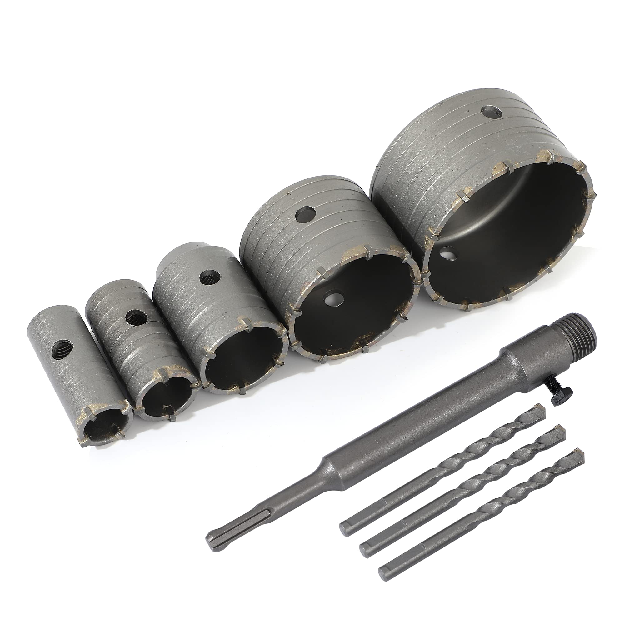 【5サイズコンクリートドリルセット】直径30〜100mm お得な5サイズ(30mm 35mm 50mm 75mm 100mm)、20cmシャフト、センタードリル付き。