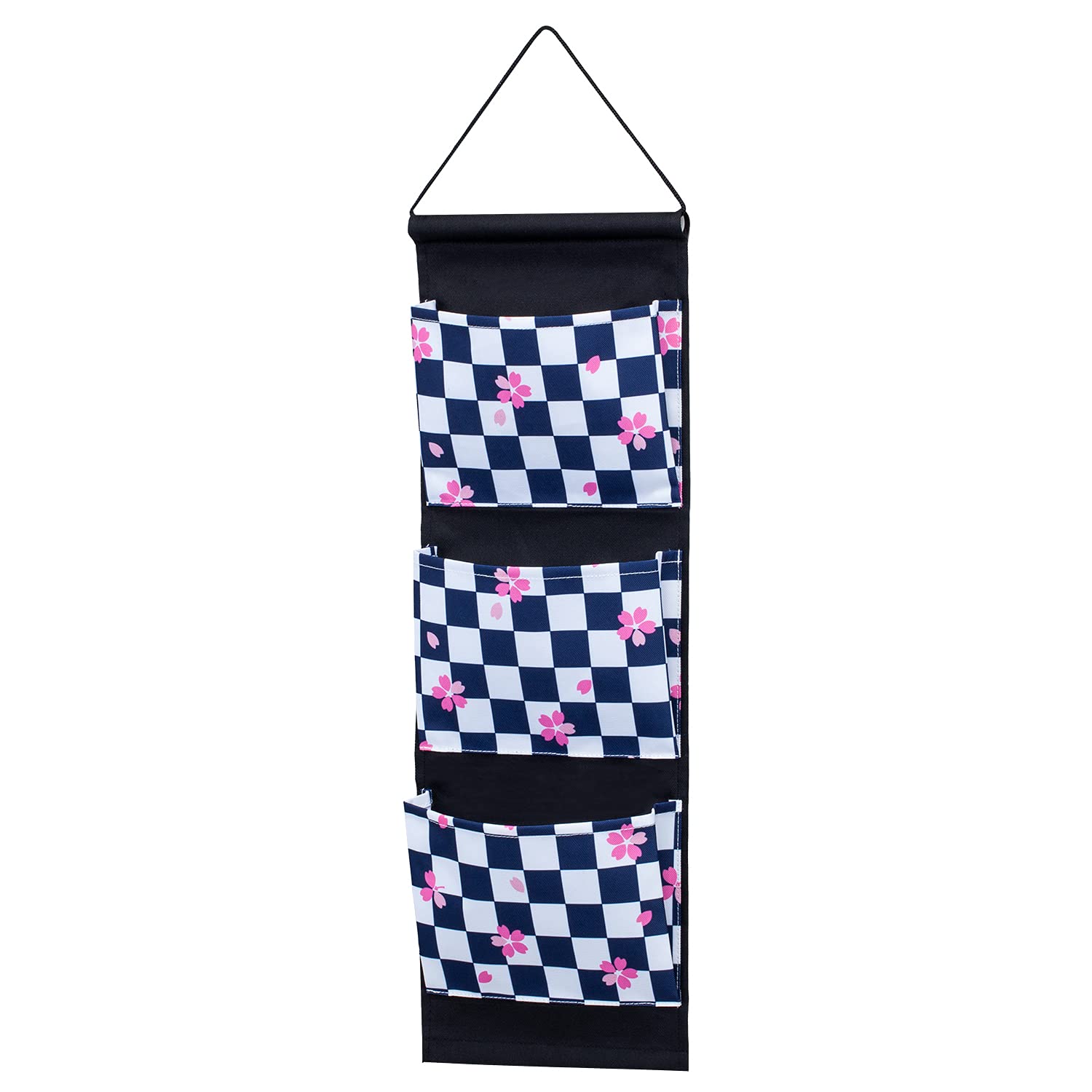 アストロ ウォールポケット 3段 ネイビー×ホワイト 市松模様×サクラ柄 マスク入れ 吊り下げ収納 壁面収納 壁掛け 618-74