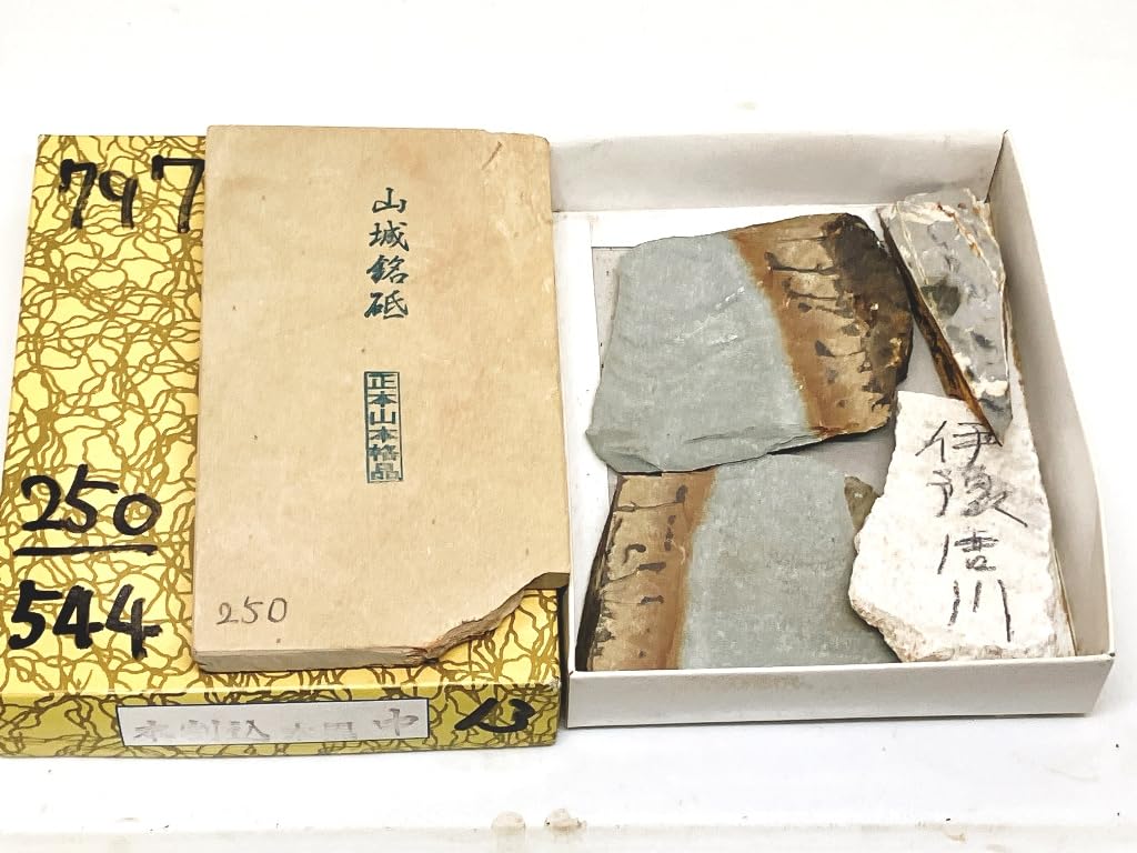色:中世山城銘砥 山本流鍛え済原石 函外寸(概寸)肥後守十丁箱入約250-544g #box797 天然砥石