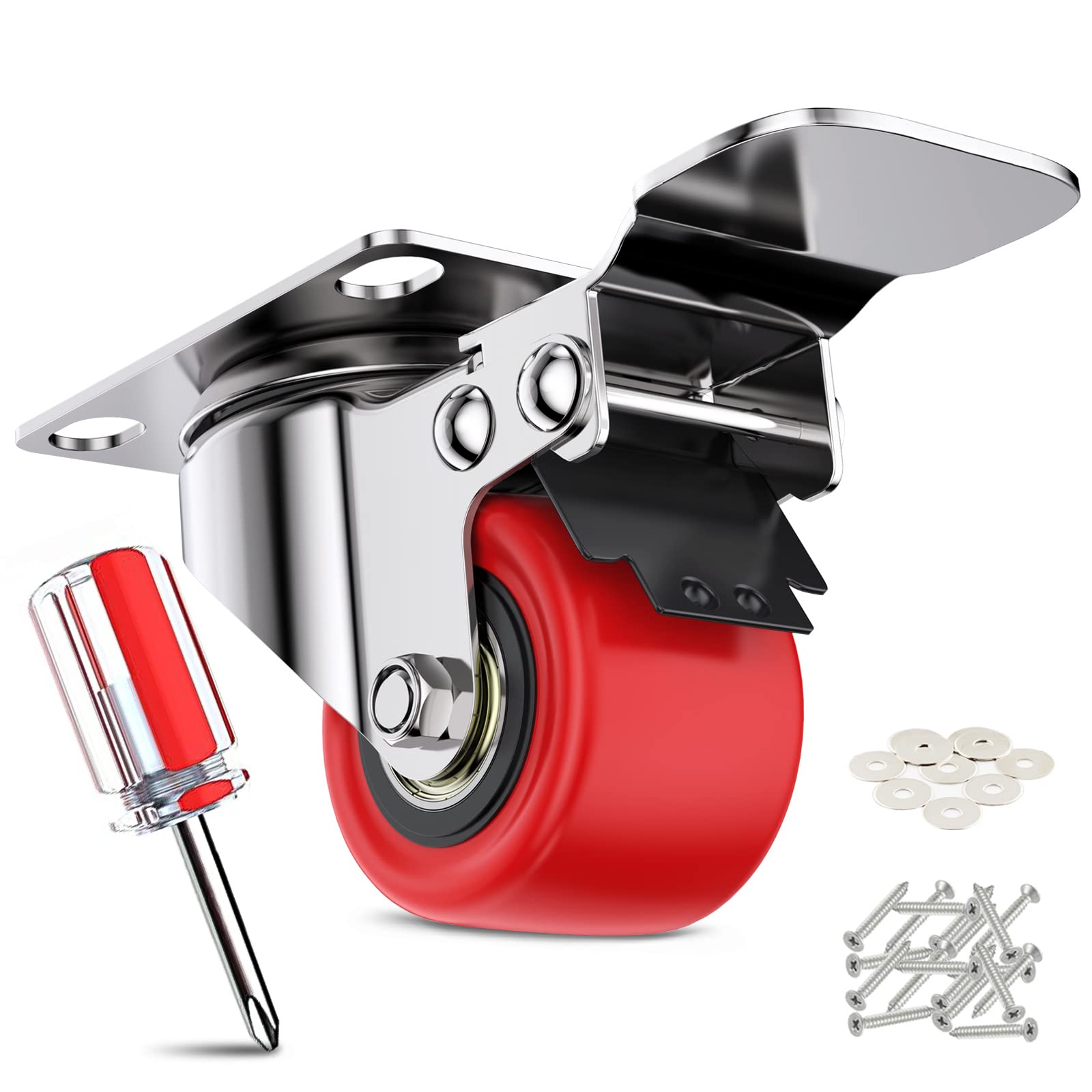 梱包内容:1.5インチキャスター本体*4、ドライバー*1、ネジ*16、ワッシャー*16。梱包サイズ:17 x 13.2 x 4.8 cm。梱包重:880g