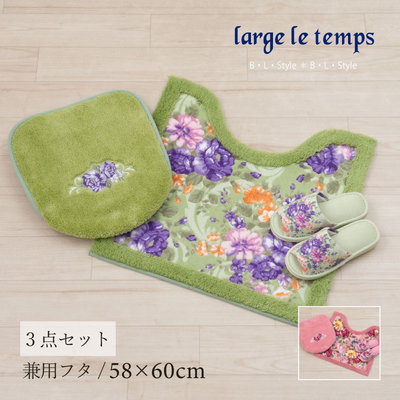 トイレマットセット 3点 約58×60cm トイレマット+兼用フタカバー+スリッパ ラルジュルタン クイーンローズ センコー