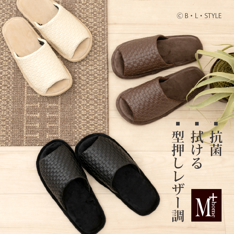 編み込んだような型押しレザー調の甲のデザインが、一般的な拭けるスリッパや業務用スリッパにはない、おしゃれで重厚感のある仕上がり。
