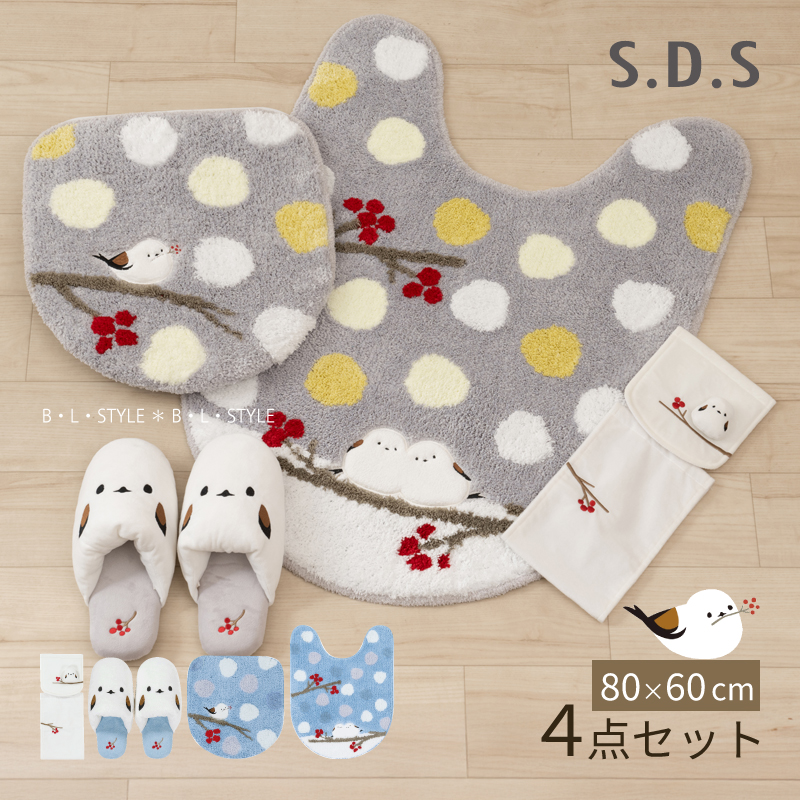 トイレマットセット 4点 約80×60cm ロングトイレマット+兼用フタカバー+スリッパ+ペーパーホルダーカバーN SDS シマエナガちゃん センコー