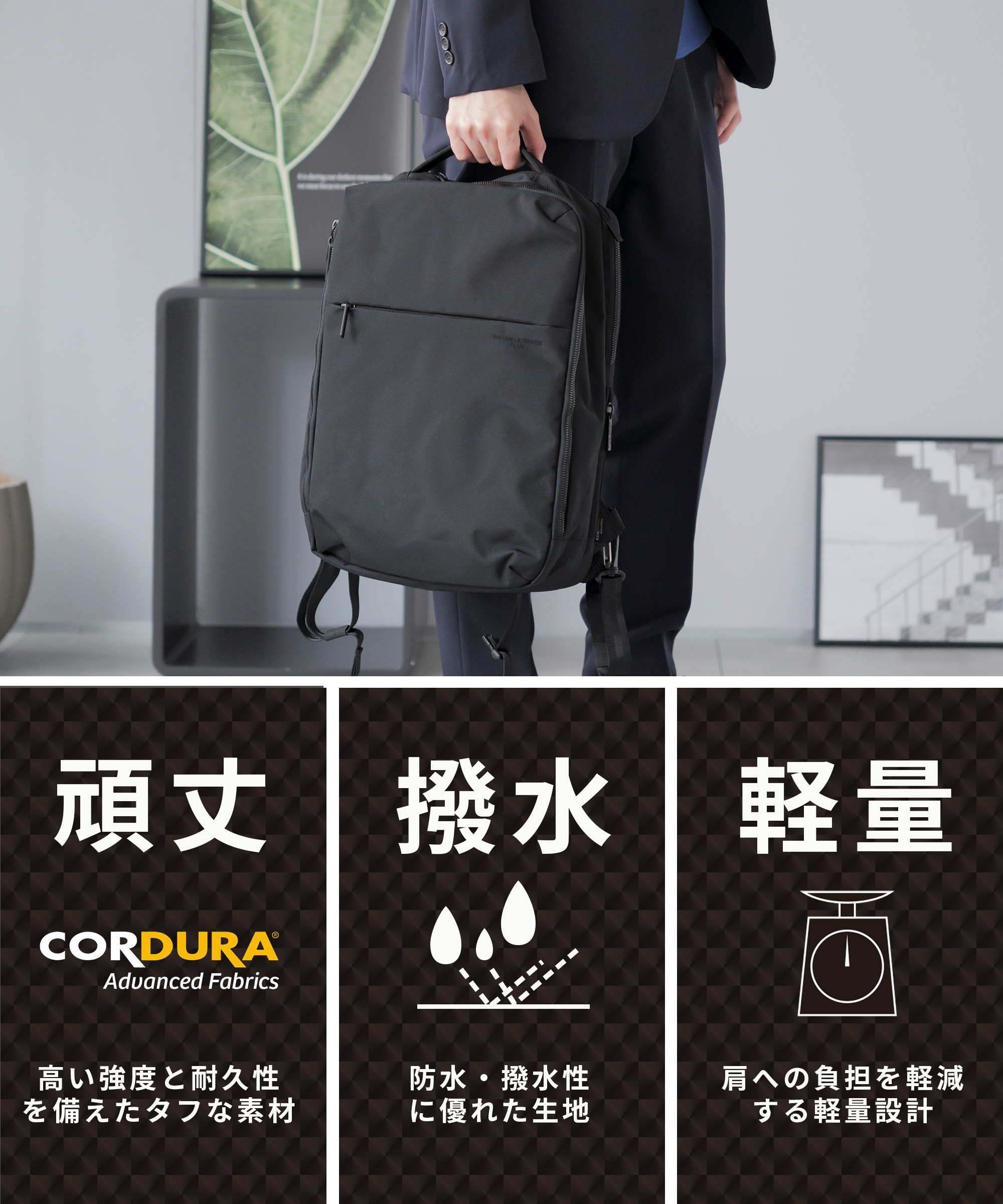 | 仕様 | シンプルデザイン&多ポケット&大容量! 「あったらいいのに」の欲しい機能を詰め込んだ多機能リュック ・ノートパソコンをしまえるスペースには衝撃緩和のクッション材を使用。 ・背負ったままでも取り出せるサイドから中に直接アクセスできるファスナーポケット。 ・水滴が中に染み込まないよう防水素材使用のポケットも装備。 ・メインルームは収納がしやすいようマチ外れるマジックテープでフルフラット仕様。 通勤・通学はもちろん、デイリーで使えるように、コーディネートを選ばないシンプルなデザインで、ジムバック、マザーズバックなど、 いろんなシーンで使える活躍します。 タフな素材「コーデュラー610Dポリエステル」 一般的な基準値に比べ10倍以上の耐摩耗性(第三者機関調べ) 擦れが起こりやすい環境でも安心のタフさ。 財布や手帳に、ノートパソコンからタブレットまで。 毎日使うものも楽々収納できる大容量! |