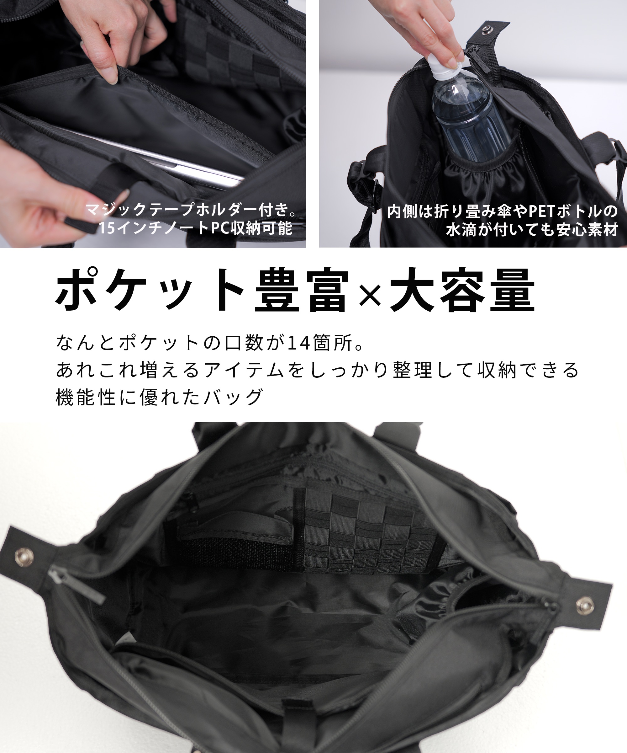 | 仕様 | 耐久性、機能性に優れた大容量トートバッグ バッグの中身をキレイにまとめる多ポケット ・15インチノートパソコンをしまえるファスナー付き大きめスペース。 ・持ったままでも取り出せるサイドから中に直接アクセスできるファスナーポケット。 ・水滴が中に染み込まないよう防水素材使用のポケットも装備。 ・タブレット等を収納するのに最適、柔らかい裏地のファスナーポケット。 ・中が見やすい大きく開くメインルーム。 通勤・通学はもちろん、デイリーで使えるように、コーディネートを選ばないシンプルなデザインで、ジムバック、マザーズバックなど、 いろんなシーンで使える活躍します。 タフな素材「コーデュラー610Dポリエステル」 通常のポリエステルに摩擦や引き裂き、 擦り切れに強く、非常に丈夫。 財布や手帳、ノートパソコンからタブレットまで。 毎日使うものも楽々収納できる大容量! |