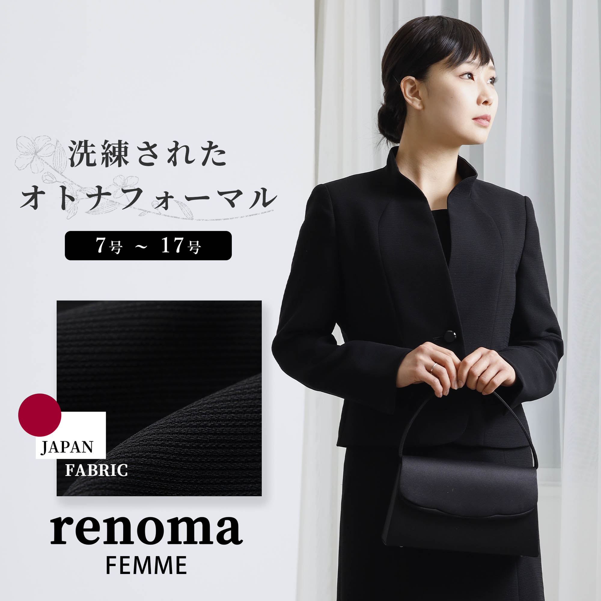 | 特徴 | 国産生地のグログランを使用した高級感のあるブラックフォーマル。フリルスタンド襟とふらしパーツデザインが洗練された大人の女性を演出します。 ジャケット、ワンピースともに、 ふらしパーツデザインにより、立体感のあるシルエットを実現。 裏地に制菌加工生地を使用しており、 汗をかいても安心なオールシーズン活用できる フォーマルスーツセットとなります。 ジャケットは気になる首周りをフリルスタンド襟がカバー。 スタンドの裏地に、サテンを使用することにより、 肌触りの良さだけでなく、襟のデザインとの相互作用で高級感を演出。 切り替えを利用した左右ポケットは お念珠やハンカチを入れるのに便利です。 袖口は折り返して長さが調節できるターンバック仕様となっております。 ワンピースは着脱が楽な前開きファスナーを採用。 ボレロジャケットを羽織っているかのように見える仕様となっており、 気になるおなか周りもすっきりと。 袖丈は6分丈と肘が隠れる丈となっており、 夏場はワンピース1枚でも着用いただけます。 裏地はサラっとした手触りのサップ生地を使用しております。 カラー:ブラック |
