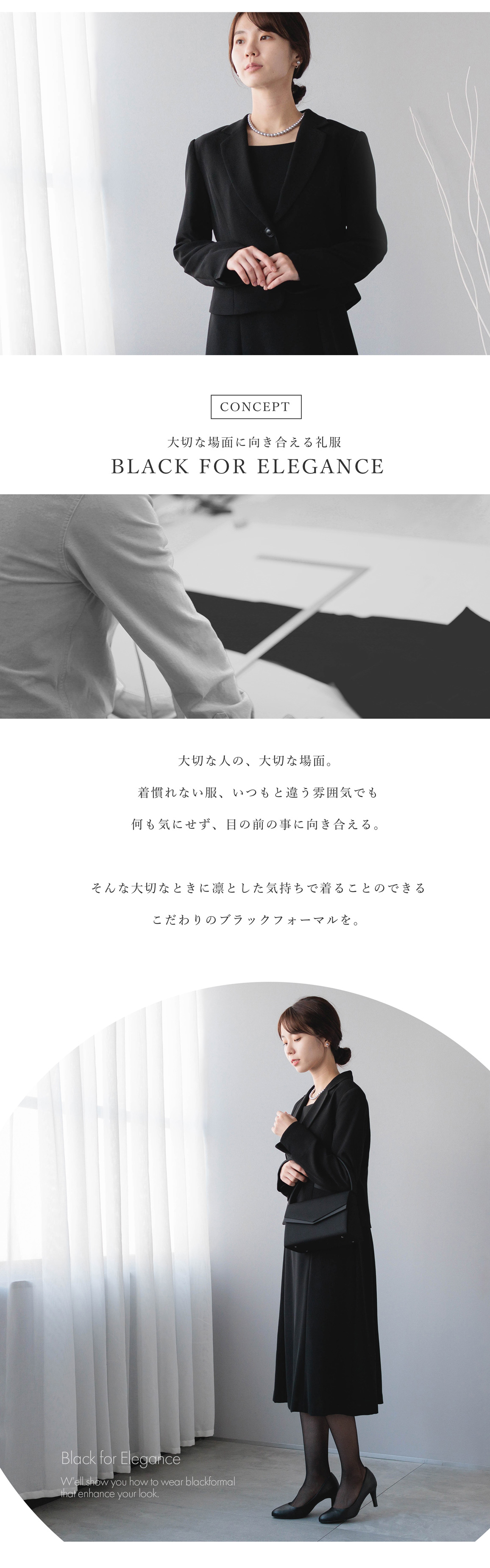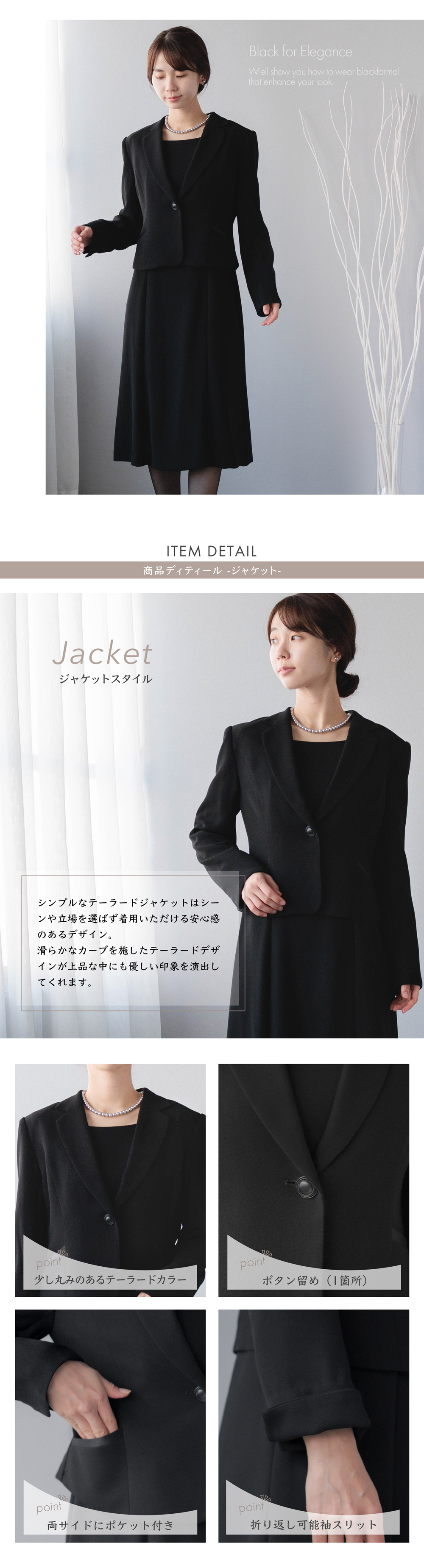 | 特徴 | 襟に滑らかなカーブを施したテーラードジャケットは、上品な中にも優しい印象を演出してくれるポイント セミフレアラインのワンピースと相まって、柔らかなシルエットのブラックフォーマルアンサンブル ワンピースはプレーンなデザインで、すっきりとした印象 フロントの切替ラインにファスナーを隠した、フロントファスナー仕様 やや高めにウエストポイントを置くことで、脚長効果もあります 袖はワンピースと同素材を使用 夏の冠婚葬祭も安心して着用いただけます 素材は濃染加工を施した、深い黒のブラックフォーマル専用生地 ご家庭の洗濯機で洗うことができる、ウォッシャブル仕様なので、お手入れが楽で、使いたいときにすぐに準備ができます 立ったときはもちろん、座ったときも膝が隠れる膝下丈 着丈105cm以上のワンピースは動きやすく、更に冠婚葬祭に適した安心感のある着丈 モデル:163cm / 9号着用 生産国:中国 |