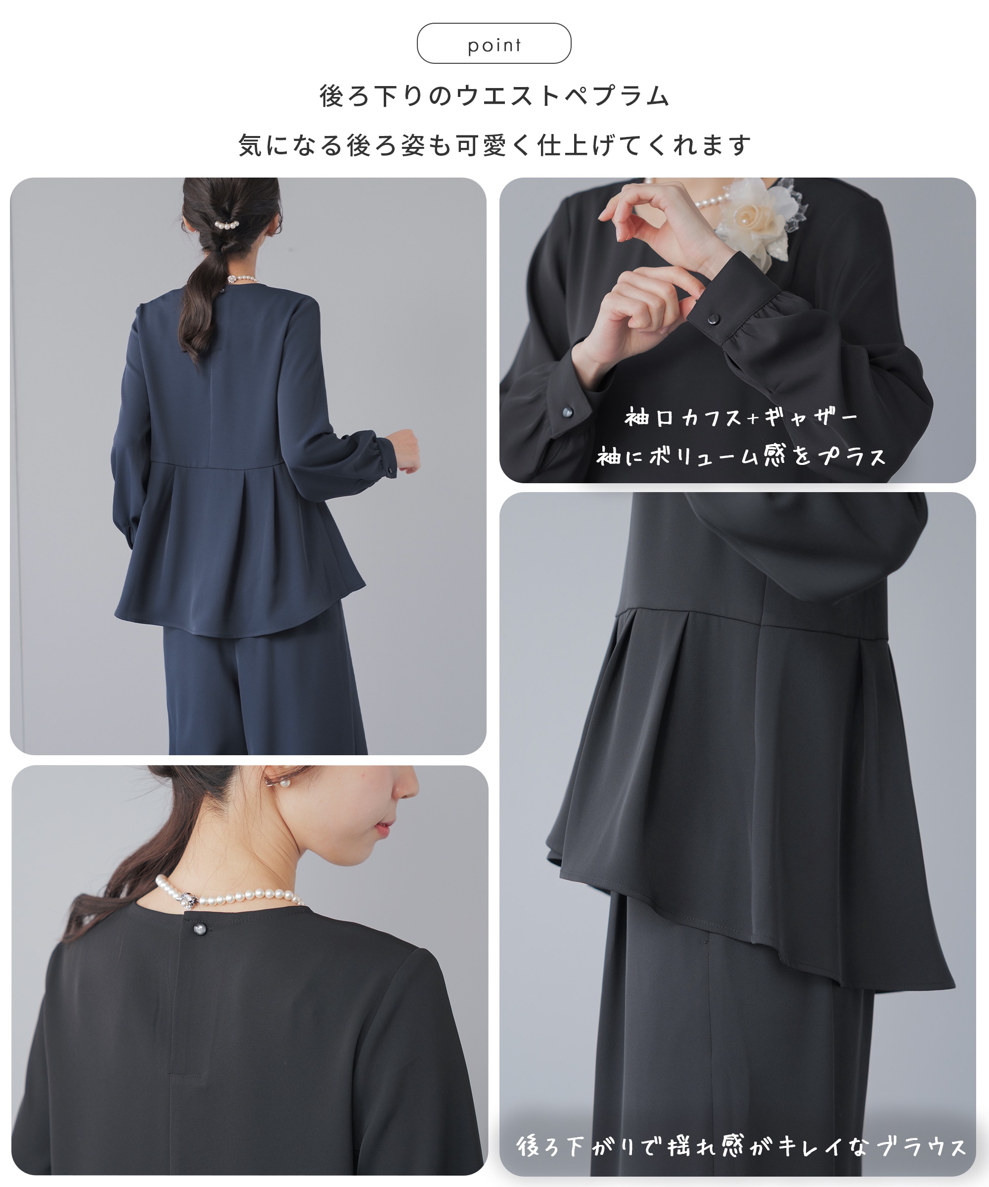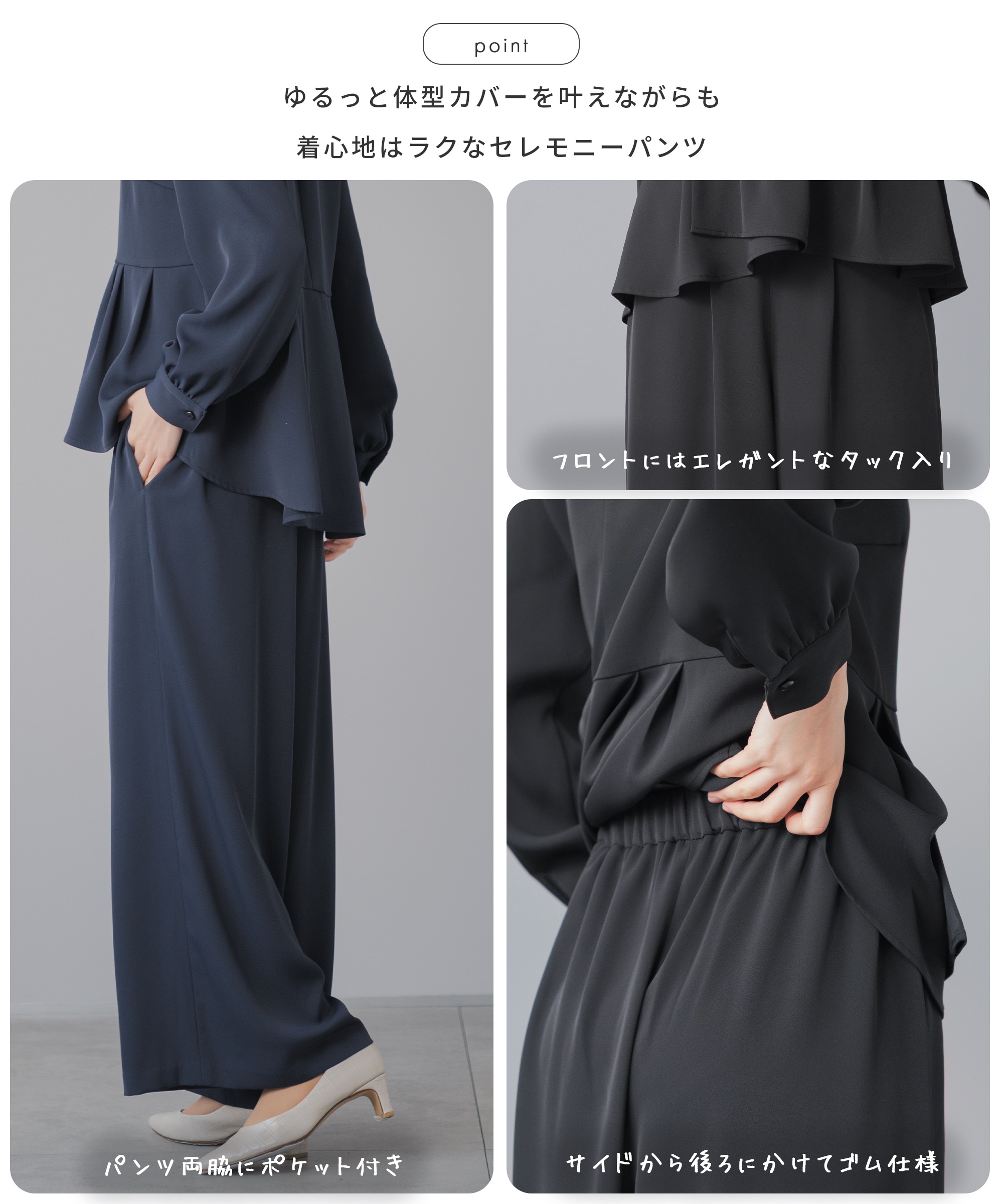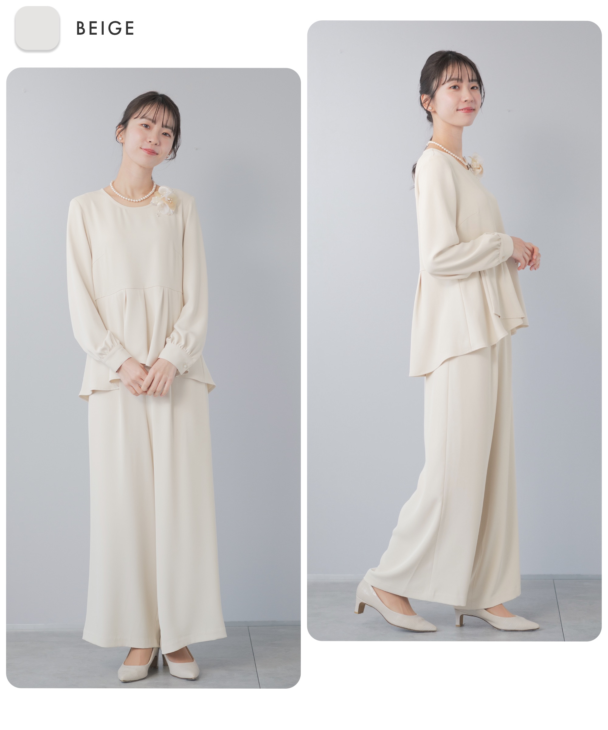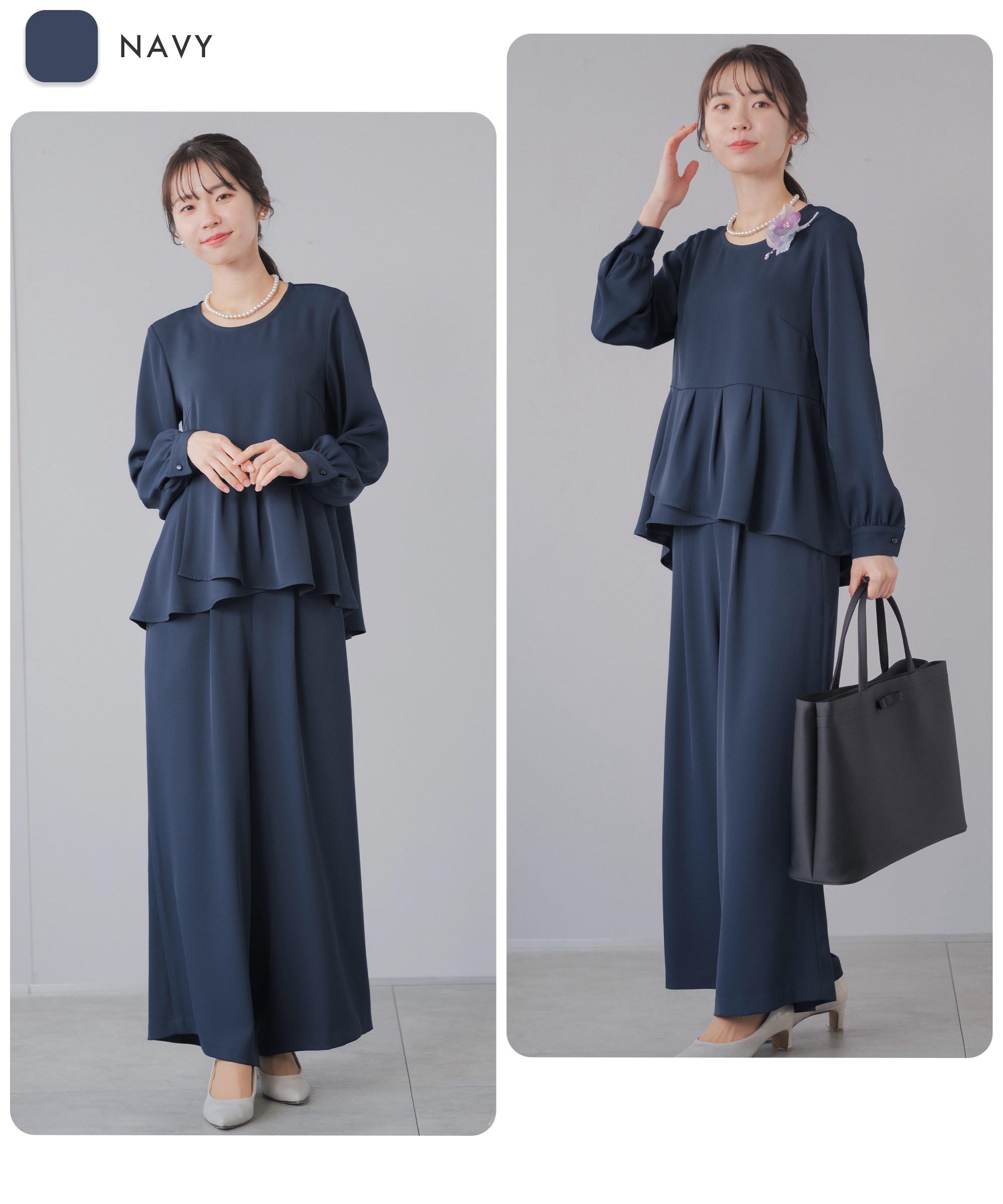 | 特徴 | さまざまな学校行事の中でも特に格式が高く、 厳かな雰囲気が漂う、卒業式や卒園式。 入園式・入学式は、子どもの晴れ舞台であるのと同時に 保護者同士や先生方との初顔合わせの場。 お子様の晴れ舞台である特別な日に彩りを添える シーンに相応しいカラーフォーマル。 堅苦しくなく、おしゃれに見える、そんな洗礼されたセレモニースーツ。 華やかすぎず、でも程よくおしゃれ。 着るだけで体型をカバーしてくれるシルエット。 アクセサリーを華やかにして、卒園式、卒業式に。 ブラウスに明るい色を入れて、入学式、入園式に。 式典の後も、ブラウスをニットやカットソーに変えて学校行事やビジネスに そのほかにも、七五三や結婚式のお呼ばれにも着回しが◎ 360°華やかなアシンメトリーペプラム 上身頃はコサージュやネックレスをつけるからシンプルなクルーネック。 袖口のギャザーが袖をふんわりと仕上げてほんの少しの可愛さをプラス 後ろ下がりにデザインされたシルエットは隠したい部分をさり気なくカバー。 落ち感とドレープ感が美しいワイドパンツ。 ストンと落ちるから体型を拾わず、 バランスよくすらっと見せてくれるシルエット。 ゆるっと体型カバーを叶えながらも 着心地はラクなセレモニーパンツ サイドから後ろにかけてのゴム仕様で楽な履き後心地を叶えながら フロントスタイルはスマートに美しく見せてくれます。 さらっとしたハリのあるドレープ感とオチ感が魅力の微光沢素材 洗濯機で洗えて シワになりにくい イージーケア素材 |