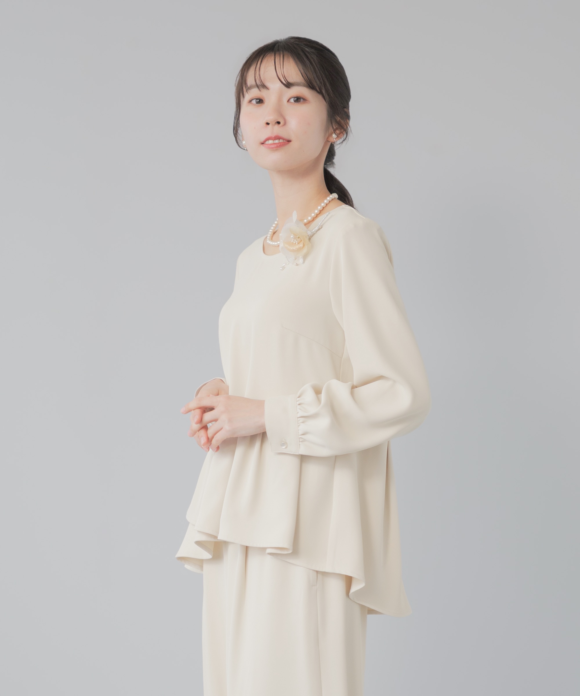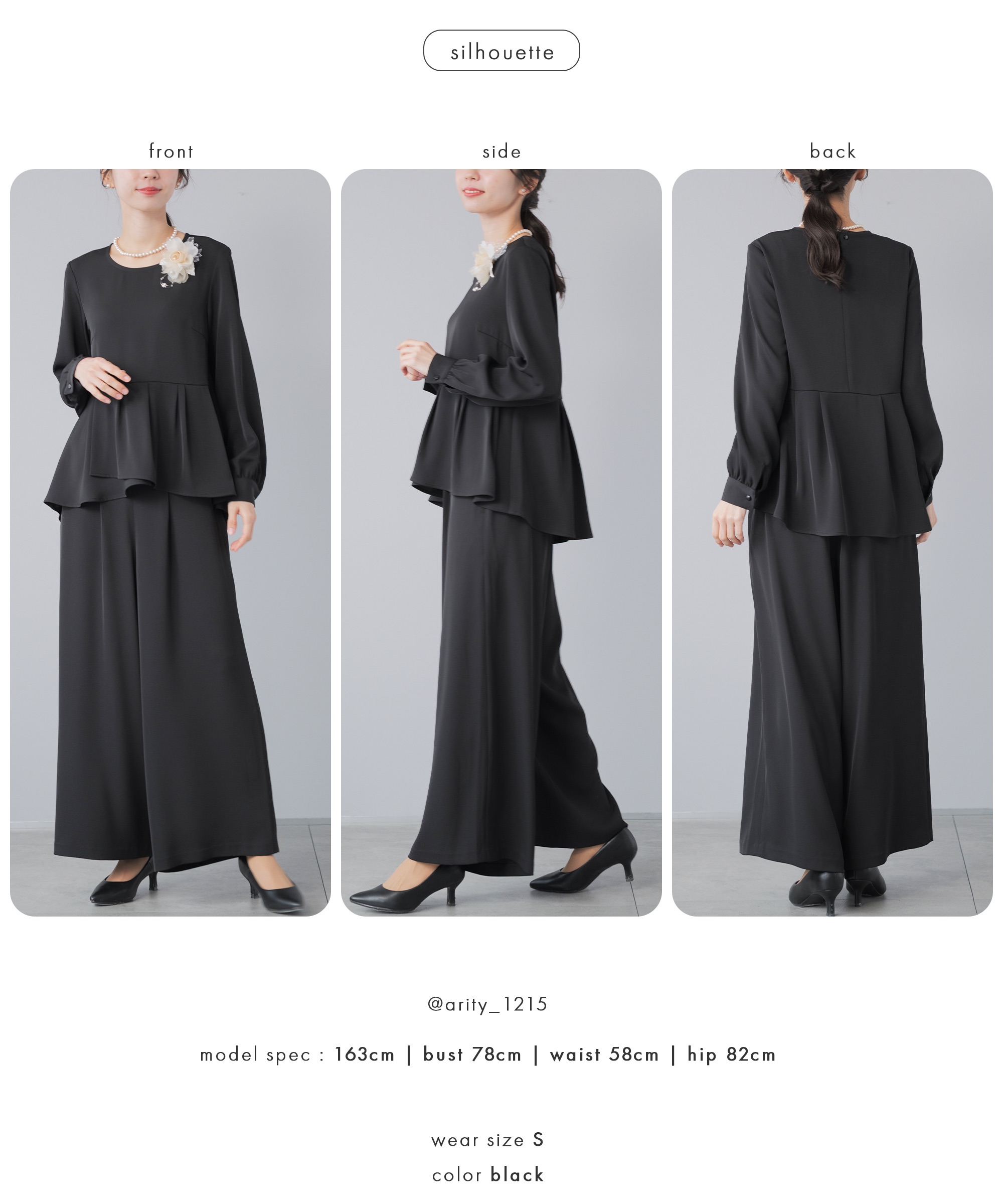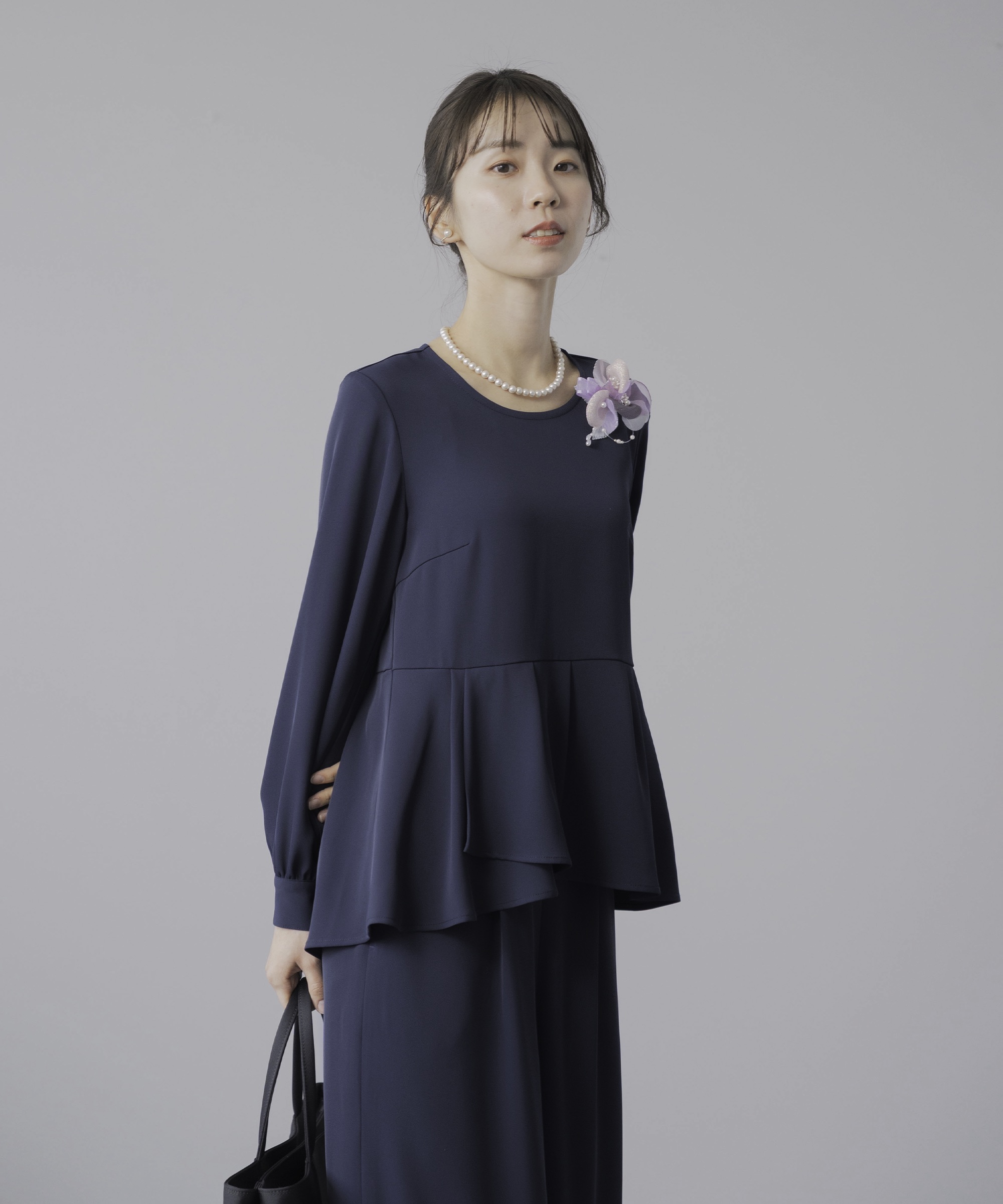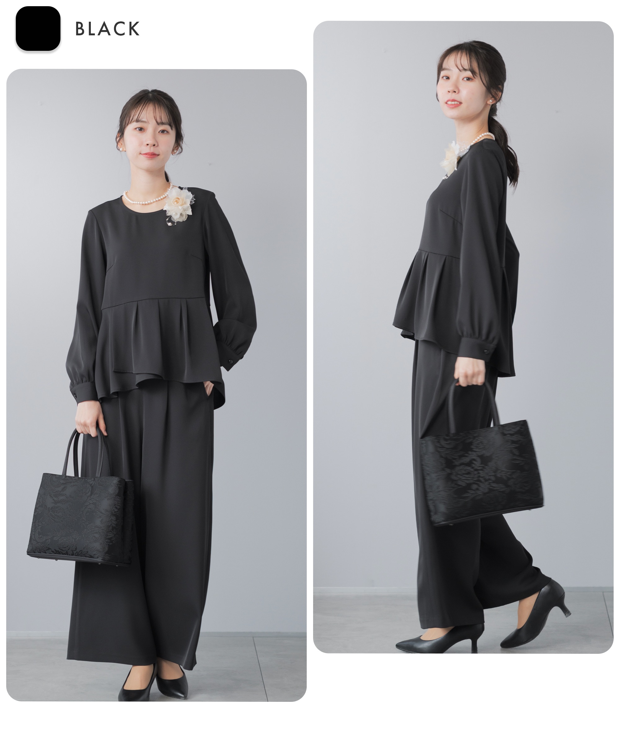 | 特徴 | さまざまな学校行事の中でも特に格式が高く、 厳かな雰囲気が漂う、卒業式や卒園式。 入園式・入学式は、子どもの晴れ舞台であるのと同時に 保護者同士や先生方との初顔合わせの場。 お子様の晴れ舞台である特別な日に彩りを添える シーンに相応しいカラーフォーマル。 堅苦しくなく、おしゃれに見える、そんな洗礼されたセレモニースーツ。 華やかすぎず、でも程よくおしゃれ。 着るだけで体型をカバーしてくれるシルエット。 アクセサリーを華やかにして、卒園式、卒業式に。 ブラウスに明るい色を入れて、入学式、入園式に。 式典の後も、ブラウスをニットやカットソーに変えて学校行事やビジネスに そのほかにも、七五三や結婚式のお呼ばれにも着回しが◎ 360°華やかなアシンメトリーペプラム 上身頃はコサージュやネックレスをつけるからシンプルなクルーネック。 袖口のギャザーが袖をふんわりと仕上げてほんの少しの可愛さをプラス 後ろ下がりにデザインされたシルエットは隠したい部分をさり気なくカバー。 落ち感とドレープ感が美しいワイドパンツ。 ストンと落ちるから体型を拾わず、 バランスよくすらっと見せてくれるシルエット。 ゆるっと体型カバーを叶えながらも 着心地はラクなセレモニーパンツ サイドから後ろにかけてのゴム仕様で楽な履き後心地を叶えながら フロントスタイルはスマートに美しく見せてくれます。 さらっとしたハリのあるドレープ感とオチ感が魅力の微光沢素材 洗濯機で洗えて シワになりにくい イージーケア素材 |