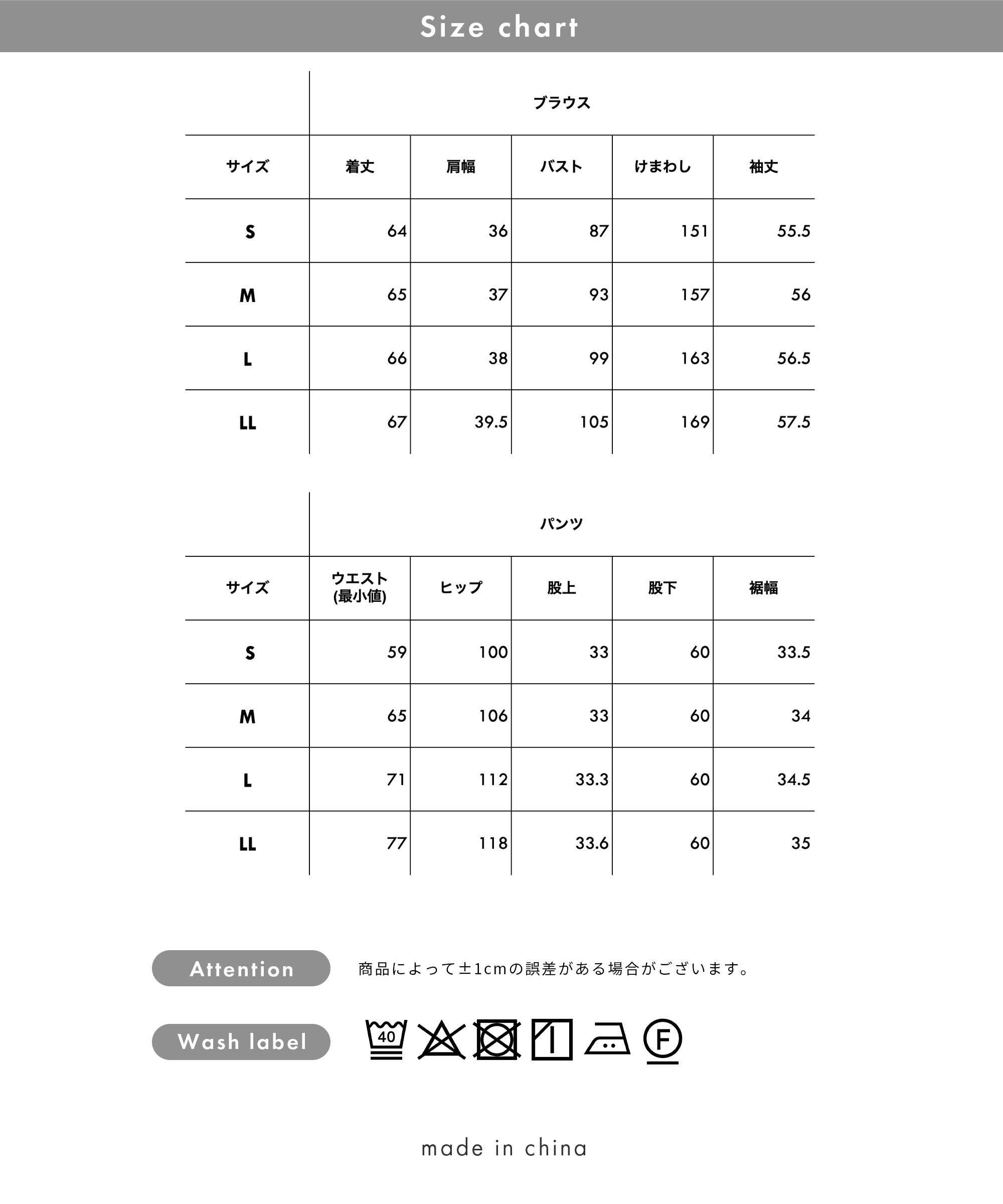 | 素材 | 【ネイビー|ブラック】 blouse 表地:ポリエステル 96% ポリウレタン 4% slacks 表地:ポリエステル 96% ポリウレタン 4% 【ベージュ】 blouse 表地:ポリエステル 96% ポリウレタン 4% slacks 表地:ポリエステル 96% ポリウレタン 4% 裏地:ポリエステル 100% |