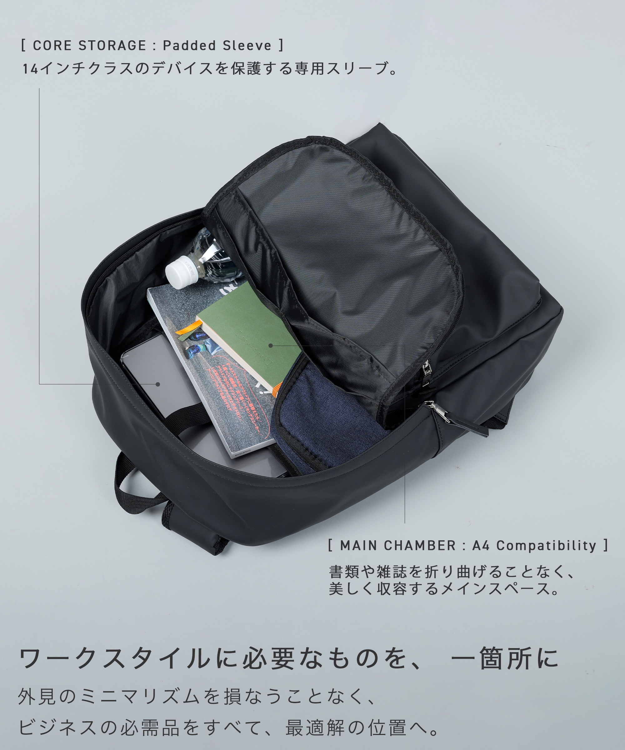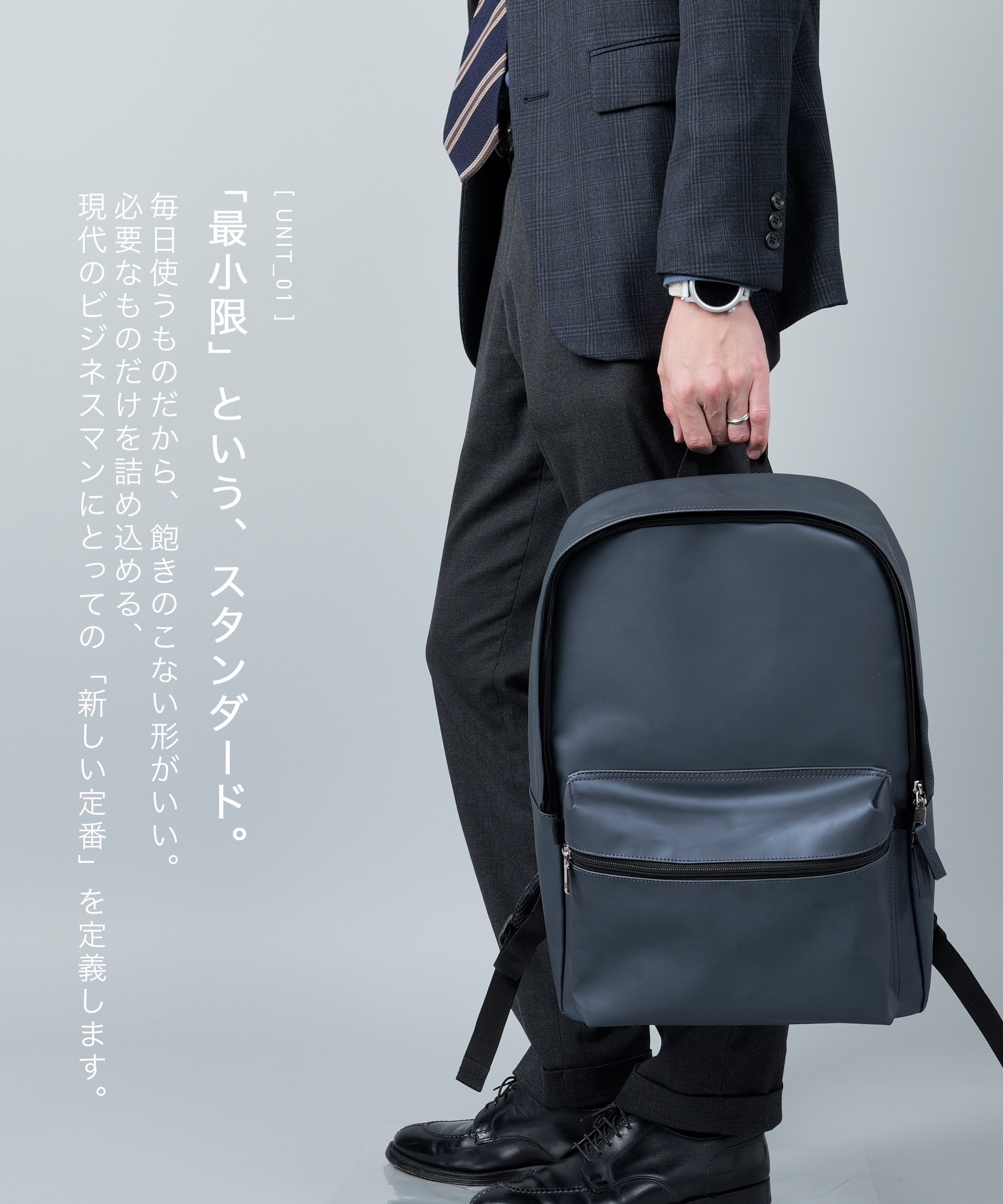 | 特徴 | ビジネスに必要な「本質」と「実用性」を、 最小限のスクエアな造形に集約したバックパック。 シンプルでミニマル。 ワークスタイルを完結させる、最小限の構成要素。 【主な特徴】 迷いを削ぎ落とした、シングル・インターフェース: 頻繁に使用するツールを「一点」に集約。複雑さを排したフロントポケットが、直感的で最短のアクセスをデザインします。 「収容」を最適化する内部空間: 14インチまでのノートPCを保護するクッションスリーブと、A4書類が美しく収まるメインルーム。整理しやすい内蔵ポケットにより、カバンの中の秩序を維持します。 都会的な品格を纏うマットPUレザー: 程よい光沢と軽量が魅力のPUレザーを採用。 「最小限」という、心地よさ: 肩に馴染むクッションベルトと、通気性に優れた背面メッシュ。過剰な機能は持たせず、日々の移動をそっと支える「ちょうどいい」使い心地を追求しました。 淀みのない操作性: 左右どちらからでも開閉可能なダブルスライダーと、指先に馴染むオリジナルの引き手。細部にまで「ストレスのない動作」をデザインしています。 【製品仕様(スペック)】 ブランド名: AWC | Active Worker Components 製品名: Urban Standard Pack カラー: ブラック / ネイビー 外寸: 約 幅 310mm × 高さ 450mm × マチ 140mm 素材: PUレザー(人工皮革)、ポリエステル 機能: 14インチPC収納、A4サイズ対応、背面メッシュ |