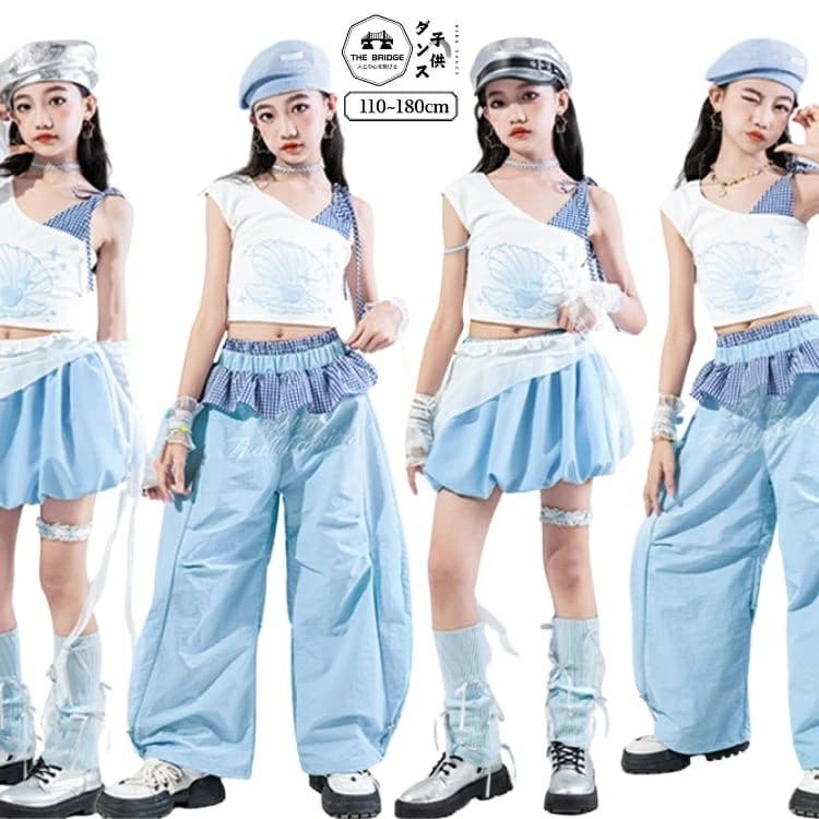 キッズダンス ダンス衣装 セットアップ 水色 チョッキ パンツ スカート 白 カーゴパンツ キッズ ダンス 衣装 韓国 アイドル おしゃれ 団体服 ストリート系 演出