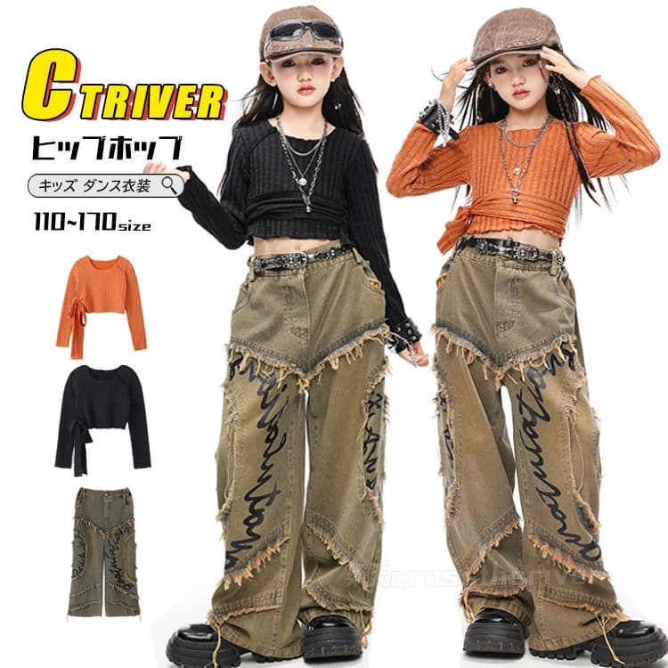 k-pop 衣装 キッズ ダンス衣装 セットアップ へそ出し トップス デニムパンツ ダメージ 茶 ジーンズ 黒 オレンジ 長袖シャツ ロングパンツ 長パンツ グリーン ヒ