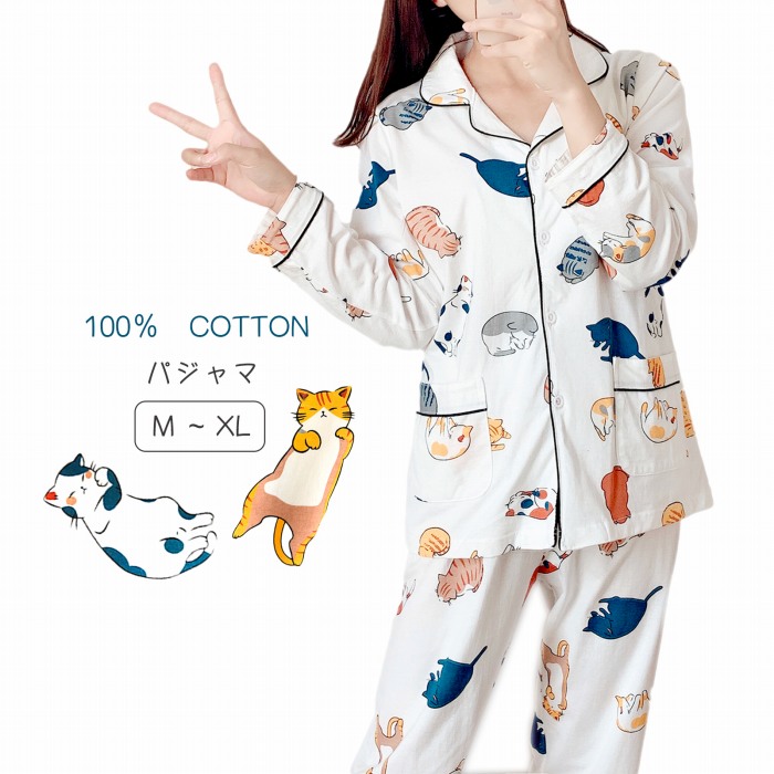 スイモク ネコ柄 パジャマ 綿100% 長袖 ルームウェア セットアップ ペアパジャマ レディース 上下セット 2ways 部屋着 薄手 柔らかい 5677470 水沐良品