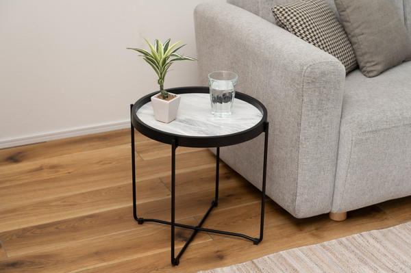 【検索キーワード】ラウンドテーブル トレーテーブル センターテーブル 大理石調 トレー サイドテーブル ナイトテーブル 折りたたみ可 天板取り外し可 ソファサイド ベッドサイド 丸型 Sサイズ おしゃれ 高級感 ブラック