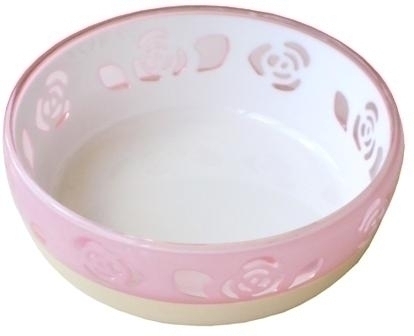 可愛い色使いのネコちゃん用食器。バラ柄が半透明でおしゃれ♪浅型形状で側面が広がっているのでネコちゃんが食べやすい!底部が樹脂製で安定感があり、すべりにくい加工となっております。