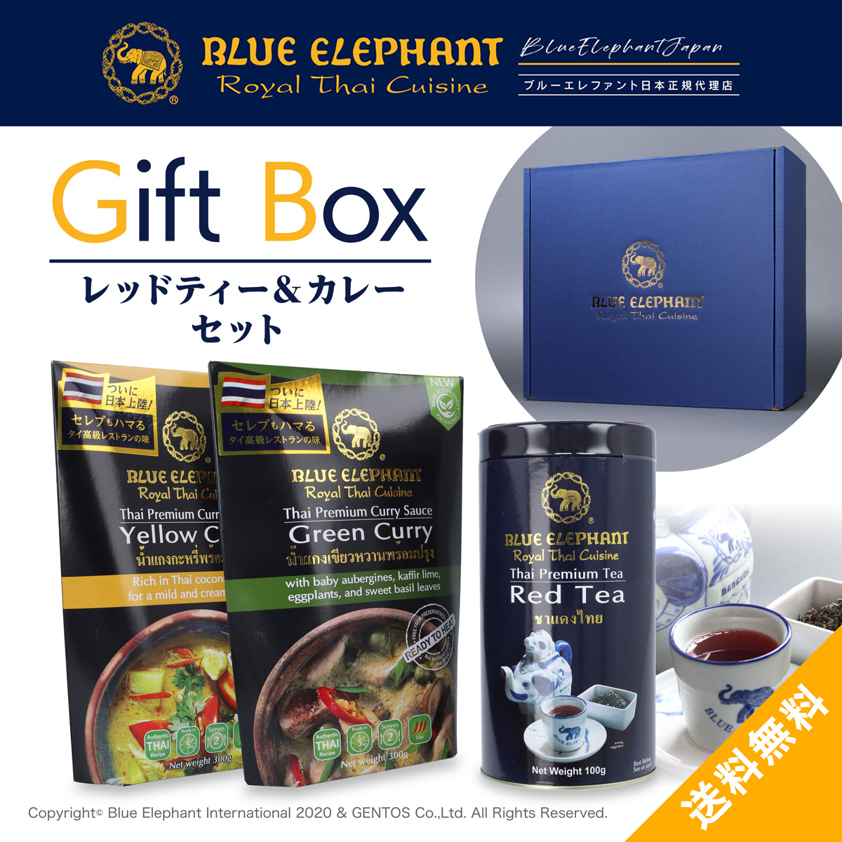 甘いバニラの香りが魅力の「タイレッドティー」と、水を加えて温めるだけで完成する「すぐ食べられるカレー&スープ」のカレー2種類がオリジナルギフト箱に入ったセット。