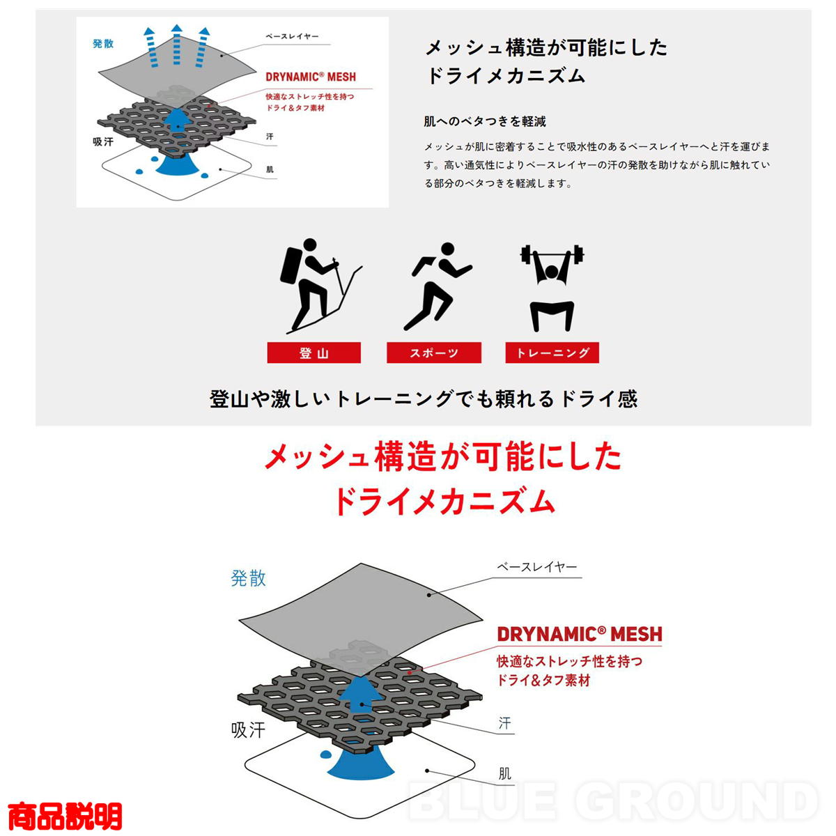 ・汗はメッシュを抜けて素早くベースレイヤーに移行し、肌をドライな状態に維持するため、安全かつ快適性に優れる山装備に必須のDRYNAMIC MESHレイヤー