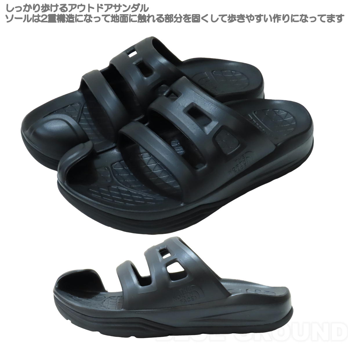 Function:軽量ビフォー、アフターアクティビティサンダル/ハイリバウンドEVA素材使用/セミロッカー構造採用/内外非対称構造を採用したボトムで安定した歩行を促す
