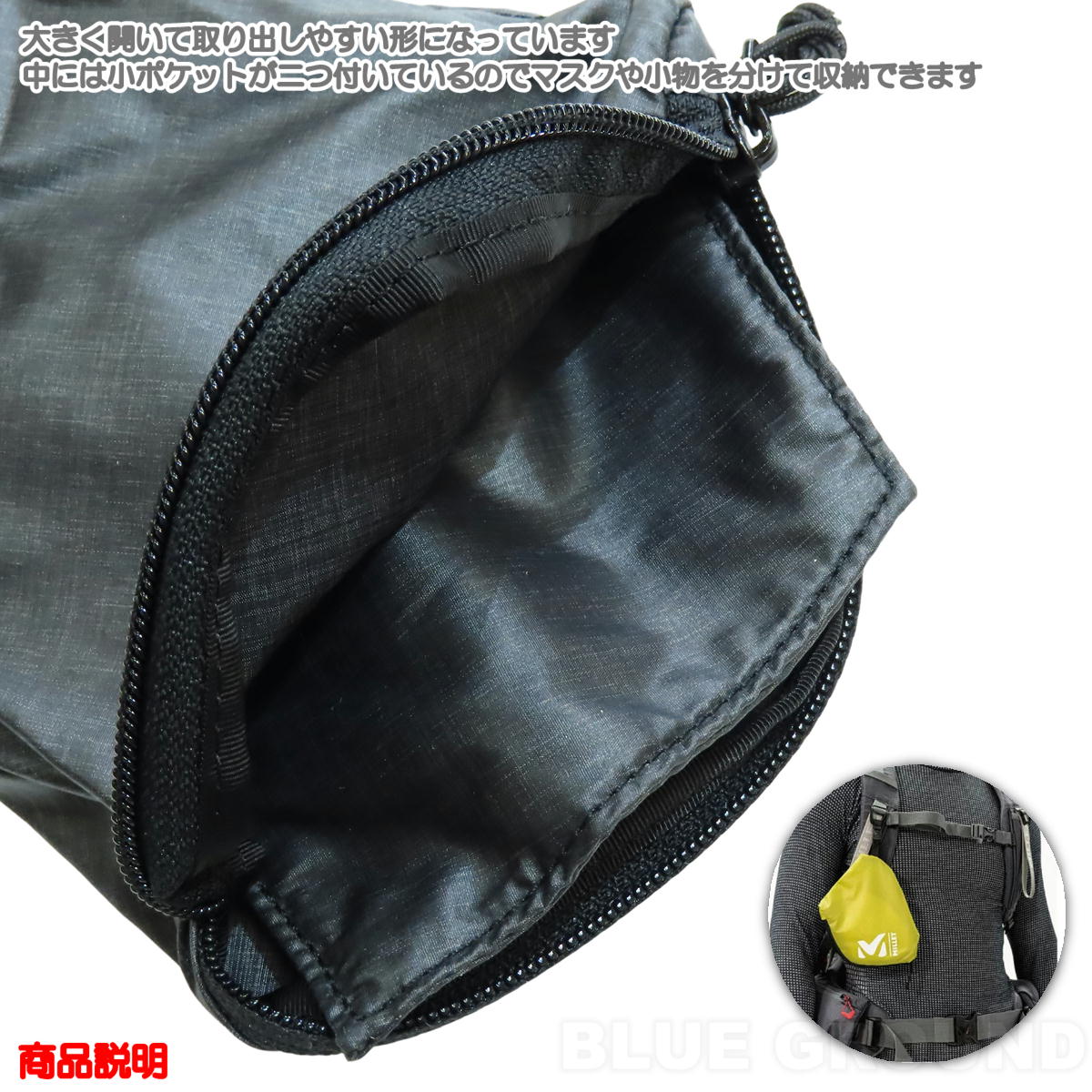 下向きの状態でジッパーを開けても中のものが落ちないポケット。マスクの仕分け収納や消毒ジェル、日焼け止め等の小物収納にも。