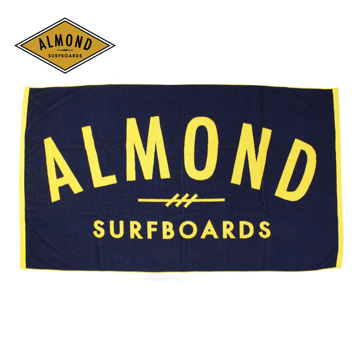 「ALMOND」ロゴが全面デザインされたサーフライクなタオル。