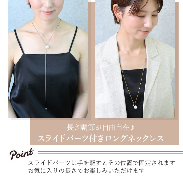 | 商品説明 | 変色しにくい、変形しにくい、傷が付けにくい、 金属アレルギーに強いステンレスのネックレスです。 お好きな位置にポイントを持ってこられる大人気のスライドネックレス。 艶やかなパールがネックレストップになったデザインで、上品さとこなれ感をプラス。 スライドパーツでパールの位置を調整できるので、その日のコーディネートやシーンに合わせてお楽しみいただけます◎ |