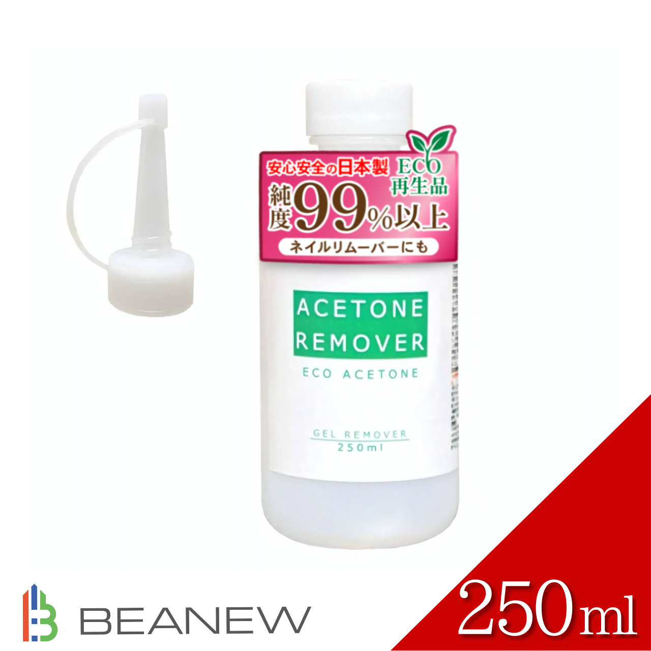 アセトンリムーバー 250ml 注ぎ用とんがりキャップ付き 小ボトル ビー・エヌ エコ ネイルリムーバー 除光液 脱脂 洗浄 アセトン ジェルネイル