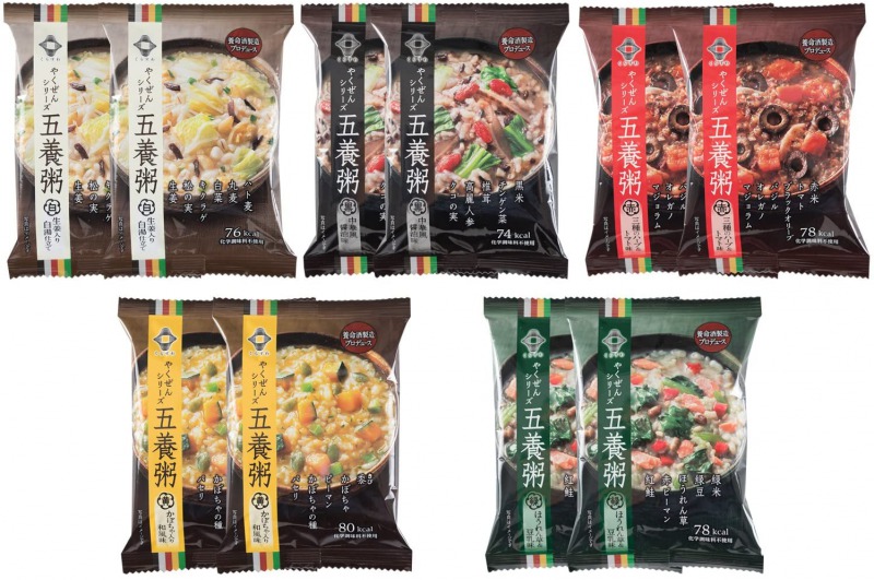 ●五養粥 黒:精白米(国産)、チンゲン菜、黒米(国産)、エキス(チキンエキス、ほたてエキス、酵母エキス)、しょうゆ(小麦・大豆を含む)、おろししょうが、クコの実、でん粉、食塩、ごま油、たん白加水分解物(豚肉を含む)、乾椎茸、ごま、高麗人参、オイスターソース(魚醤(魚介類)を含む)/トレハロース、酸化防止剤(V.E)