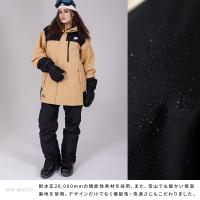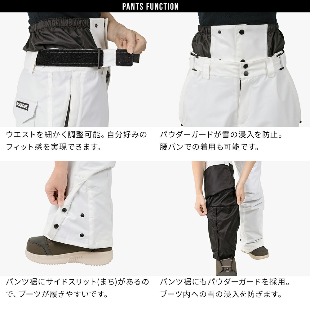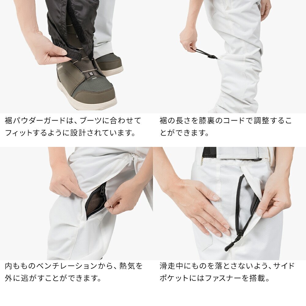 ウエスト調整が可能で、裾とウエストにはパウダーガードがあり、雪の侵入を防ぎます。