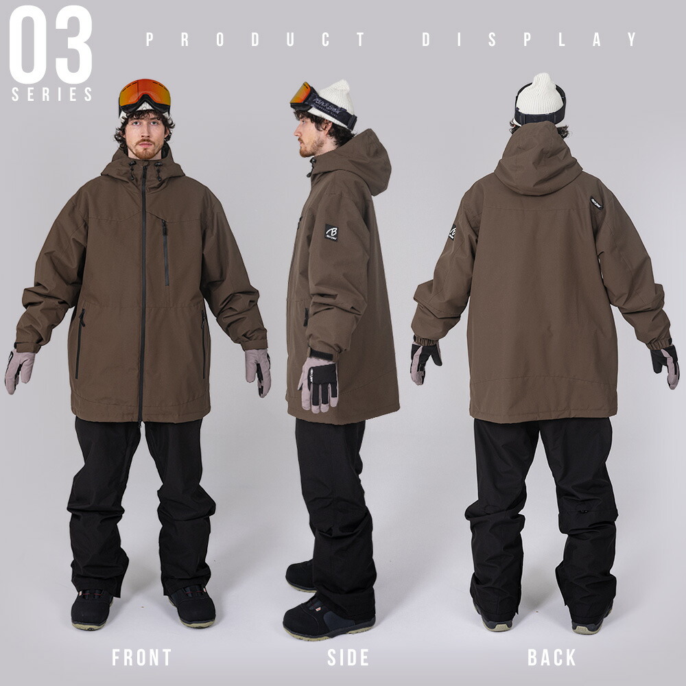 フード、袖口、裾が調整可能で、サイドポケットやファスナー付き胸ポケット、ゴーグルポケット、IDカードケースなど収納力も充実。
