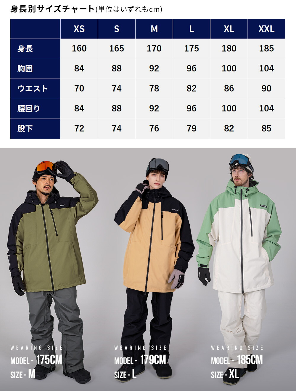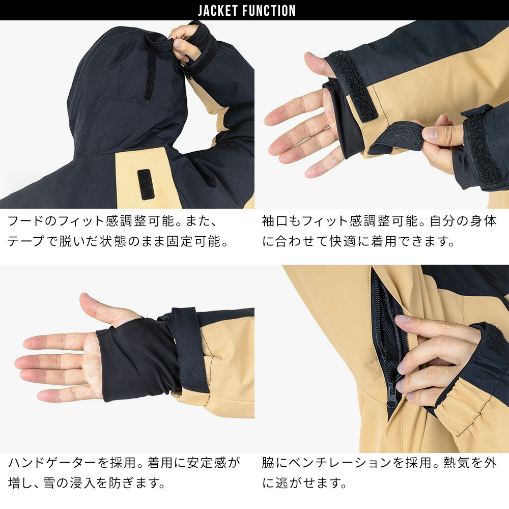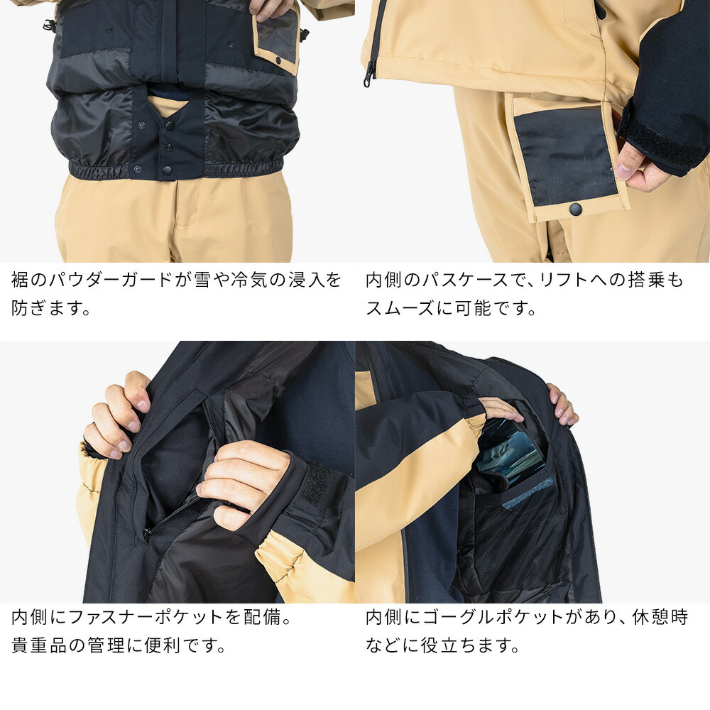 フード、袖口、裾が調整可能で、サイドポケットやファスナー付き胸ポケット、ゴーグルポケット、IDカードケースなど収納力も充実。